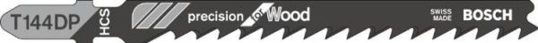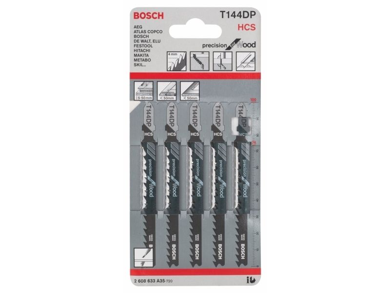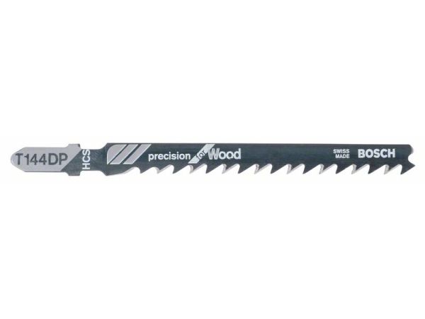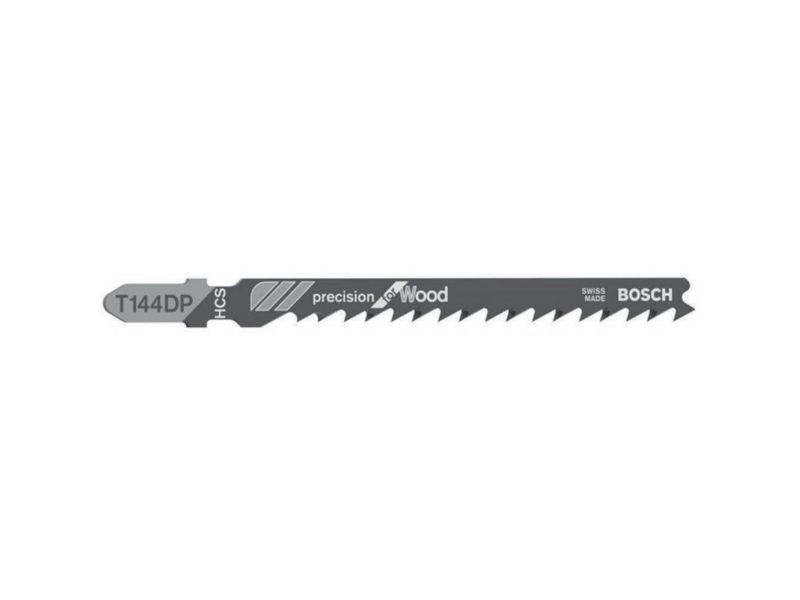 Details - Material HCS. - Tooth design side set, ground. - Total length [mm] 100. - Tooth spacing [mm] 4. - Areas of application Softwood, chipboards, wood core plywood, fibre boards (5-50 mm), doors, kitchen worktops (<50 mm). - Type T 144 DP.