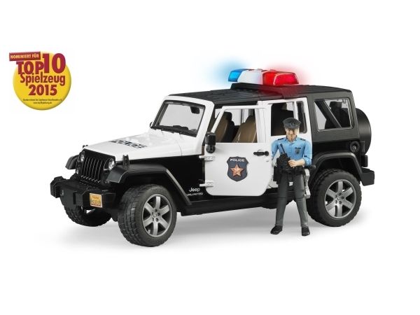 The BRUDER product range is very extensive. Numerous vehicles for construction, emergency services, commercial vehicles, leisure time, agriculture and forestry are cherished the world over thanks to their exciting toy worlds at a scale of 1:16. Just like in normal life, an increasing amount of BRUDER vehicle traffic means traffic violations are on the rise. For this reason, bworld now also features a police force to enforce law and order. The service vehicle is based on the familiar Jeep Wrangler Unlimited and it features the appealing and striking colour design typical in the US as well as a hazard warning light module fitted on the roof. The Jeep Wrangler Unlimited Rubicon has been designed as a police vehicle and it provides countless functions to enable almost unlimited fun and games. In addition to the two-part, detachable segment roof, the bonnet, rear door and all four side doors open. It goes without saying that the vehicle provides enough space on the inside for four BRUDER bworld figures. Alternatively, the rear seat can be removed to create space for accessories compatible with BRUDER standard connectors in the loading area. The additional drag link is intended to facilitate steering through the roof hatch and if it is not required, it can be stored in the vehicle underbody. The axles feature typical off-road vehicle suspension and tread tyres with wheels in appealing SUV design. The front interface, suitable for items including the optionally available cable winch and the detachable drawbar coupling, means there are unlimited possibilities for enhancements in the world of BRUDER. The police version of the Jeep model features a newly developed light and sound module featuring four functional buttons (1. engine sound, 2. police siren, 3. fire service siren, 4. yelp signal). The bworld police officer is fully equipped to reinforce the authority. The waist belt features important tools for day-to-day police work, such as torch, radio device and truncheon.