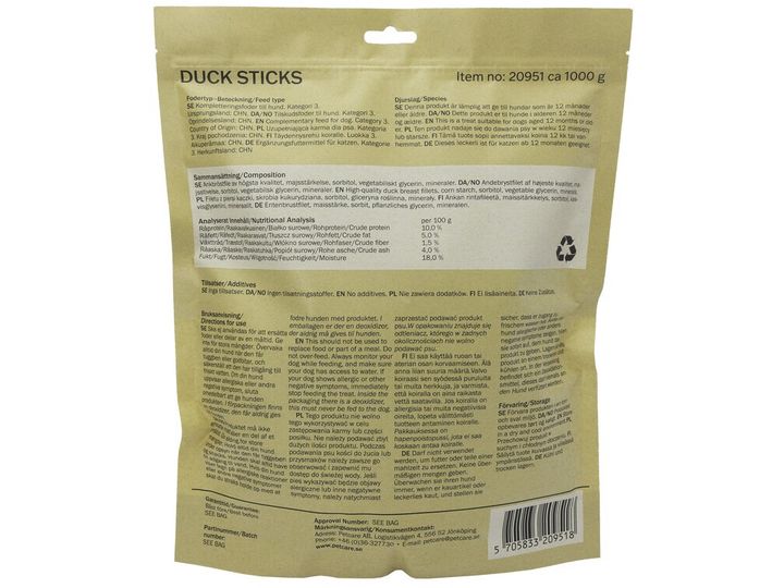 Great taste Protein from duck Good for dental health. Reclosable bag