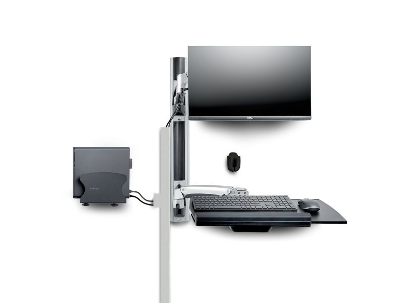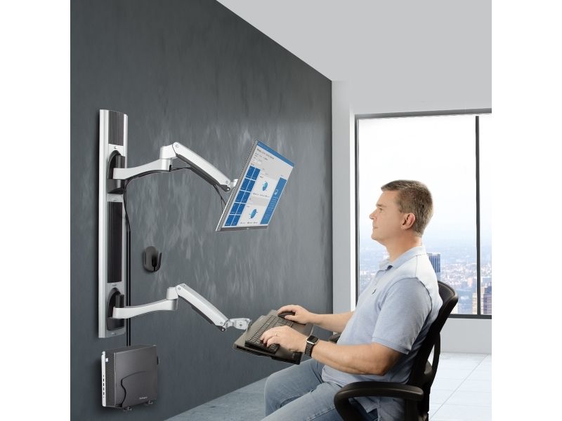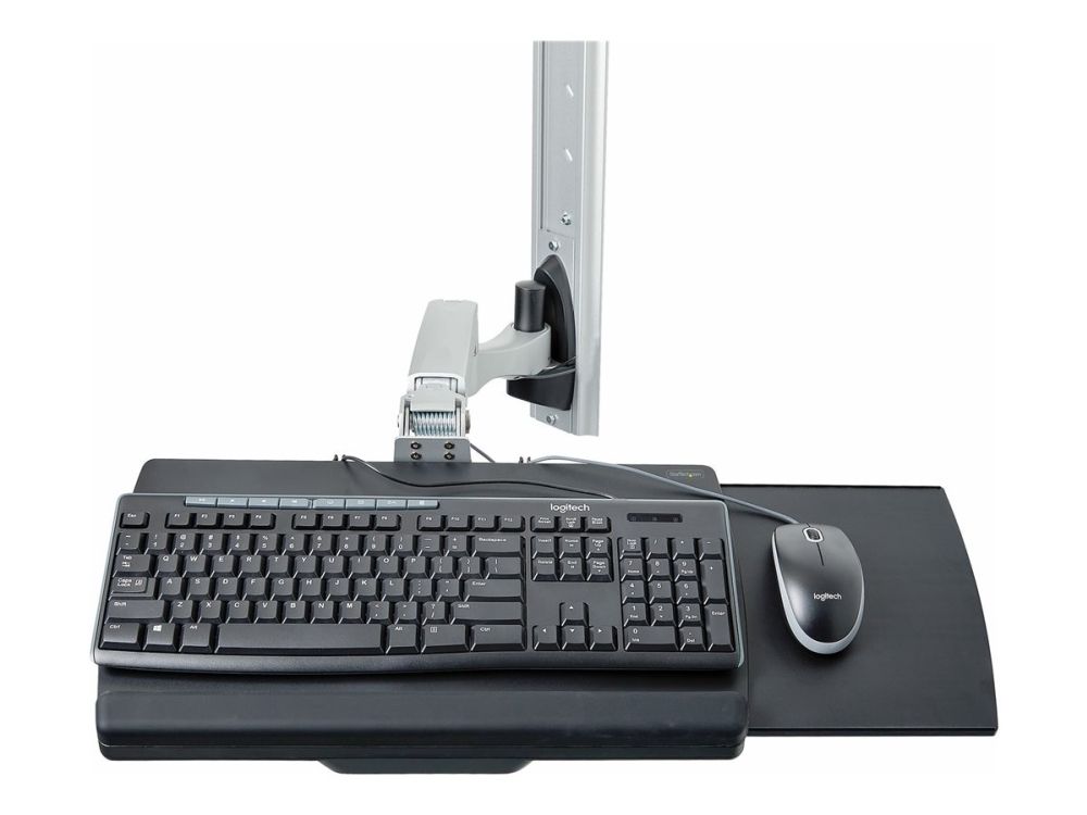 Included in the package are all necessary mounting hardware and detailed instructions, making installation straightforward. The ergonomic design, featuring a keyboard tray with a wrist rest, further enhances user comfort. Suitable for both landscape and portrait orientations, it adapts to any task, from data analysis to graphic design, ensuring a productive and comfortable work environment.