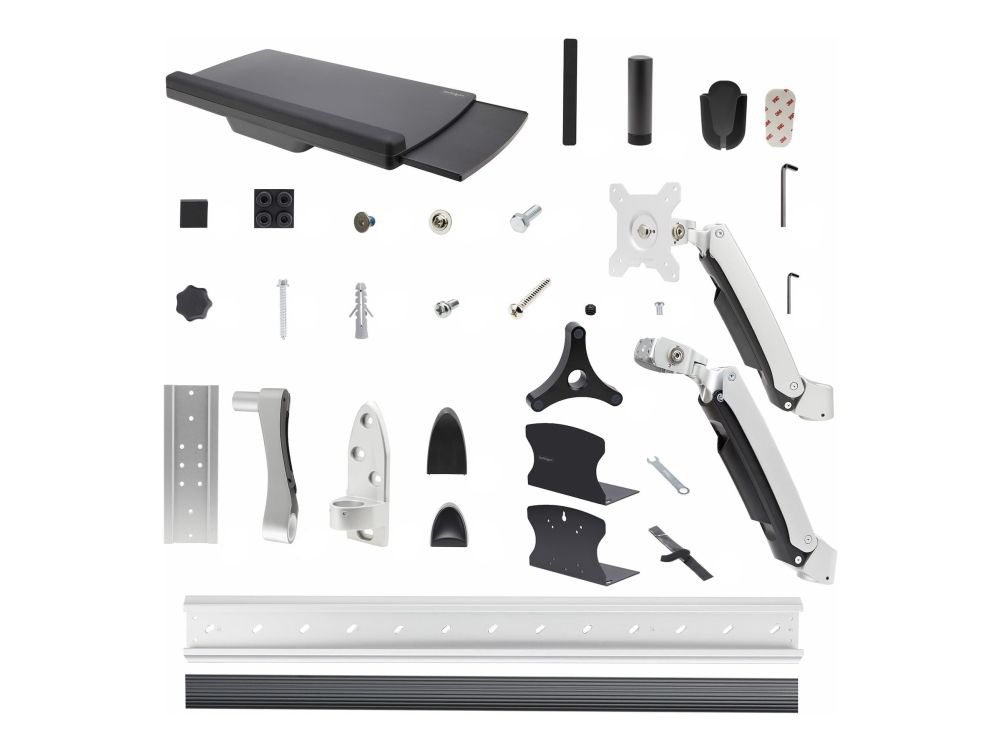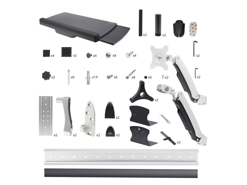 2 x fjederarm, 2 x drejearm, 2 x M4x6 skruer, 4 x M4x10 skruer, tastaturbakke, museholder, 4 x M6 x 18 mm skruer, svensknøgle (10 mm), 4 x M6x8 hex-skruer, 8 x M6x8 skruer, klæbende pude, mounting bracket, 2 mounting plates (spring arm), 2 upper decorative covers, 2 lower decorative covers, 2 swivel arm mounts, 2 spring arm posts, wall mounting rail (track), wall mounting rail (track cover), 2 adhesive hook and loop strips, sliding bracket, 2 rubber self-adhesive strips, 10 wall mounting screws, 2 plastic spacers, 8 rubber self-adhesive spacers, 4 rubber self-adhesive pads, 14 concrete anchors, 2 hand knobs, 2 hex keys (2.5mm), 2 hex keys (5mm), 6 x M5x4 screws, 6 wall mounting lag screws