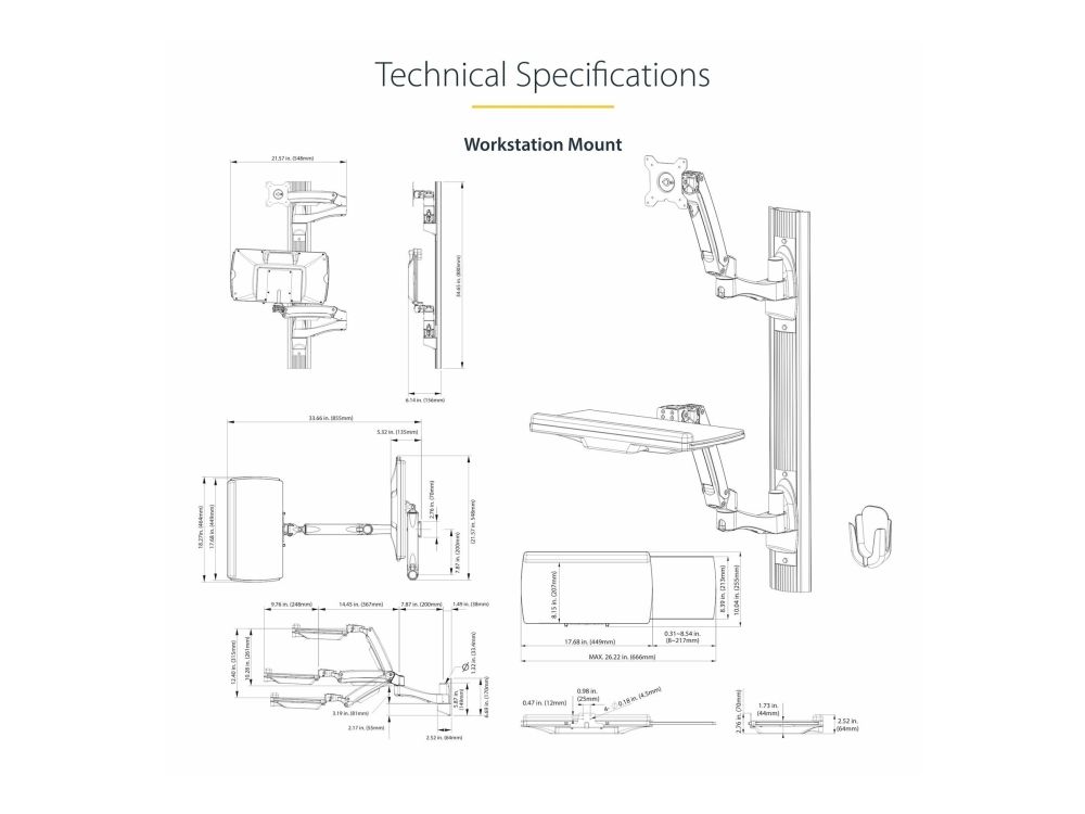 Transform your workspace with the StarTech.com Wall Mount Workstation, a versatile and ergonomic solution designed to enhance productivity and comfort. This fully articulating mounting kit supports monitors up to 32" and 22 lb, making it suitable for a wide range of display sizes. With adjustments for height, rotation, swivel, and tilt, it offers flexibility, allowing users to find the perfect viewing angle and reduce strain during long working hours. The integrated cable management system ensures a clutter-free desk, while the durable aluminum and steel construction ensures stability and longevity. Whether for professional use or personal projects, this workstation provides the ergonomic benefits and space-saving design needed for optimal performance.