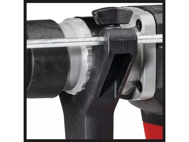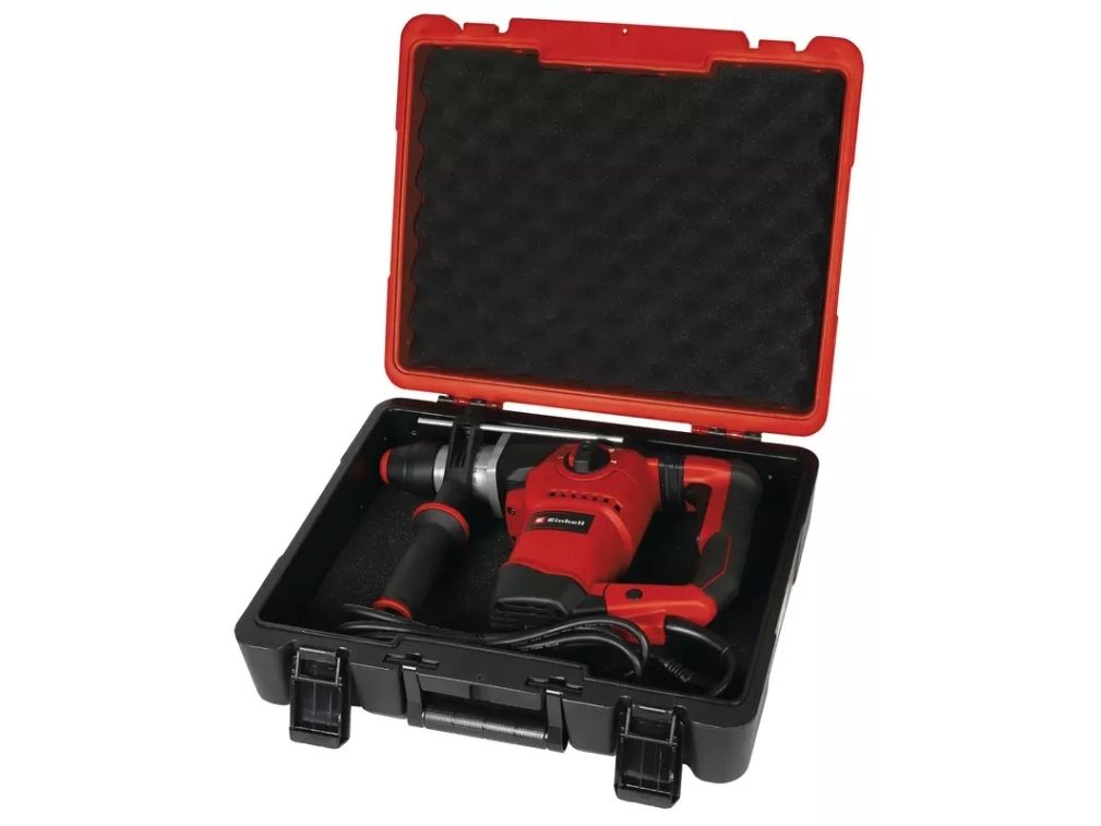 The Einhell rotary hammer TE-RH 32-1600 4F processes a wide variety of materials with four functions: A function switch can be used to select between drilling, hammer drilling and chiselling with or without fixing. The pneumatic impact mechanism guarantees excellent propulsion, both during chiseling and demolition work as well as during drilling, e.g. into concrete or stone. With speed electronics, 1600W and an impact strength of 4.5 J, the device provides a lot of power and precise work. Thanks to the 3 m long cable, it leaves enough room for a lot of freedom of movement. The infinitely adjustable drill depth stop is made of solid metal, just like the gearbox. The robust SDS-Plus tool adapter with semi-automatic operation for quick and simple tool changes. The vibration-damped handle with softgrip surface is supplemented by an additional handle with ribbing. In this way, the device can be precisely guided, even in difficult conditions. The rotary hammer TE-RH 32-1600 4F from Einhell comes in a practical transport and storage case.