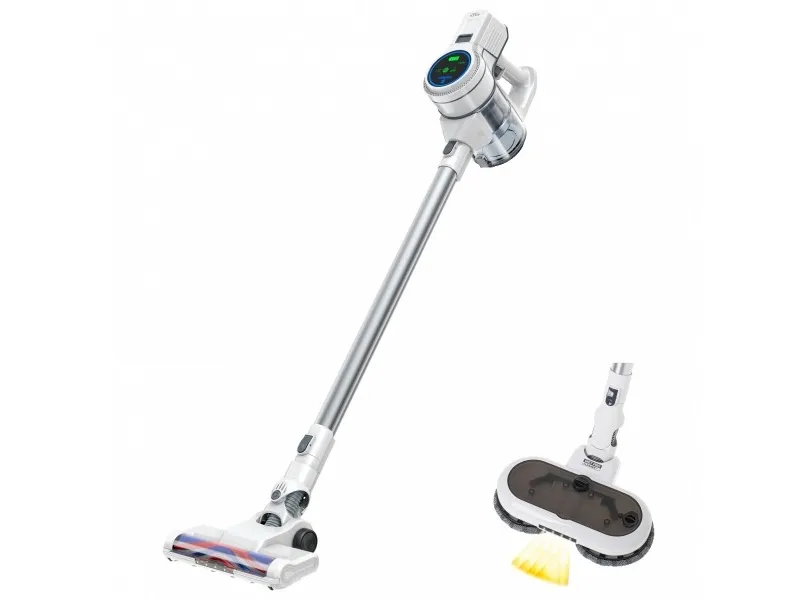 Max Power: 350W, Nom. Pow. 190W, Suction power: 13000 Pa, Water tank: 150 ml, Dust container: 600 ml, 3 working speed + AUTO mode, 2in1 brush, hard floor brush with LED, mop brush , Max working time 114 min using 2 batteries (included) Battery: 2000 mAh, Noise level: 78dB, 3 stage filtration HEPA 12