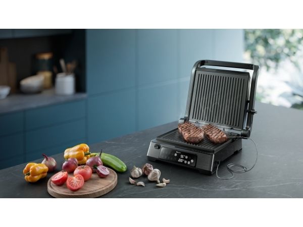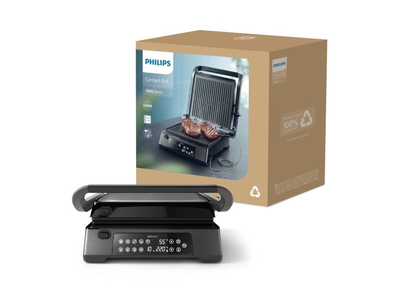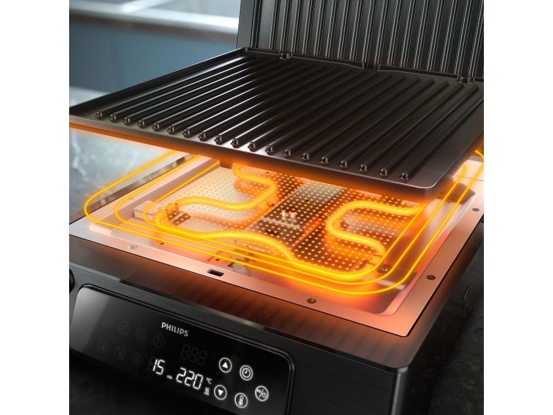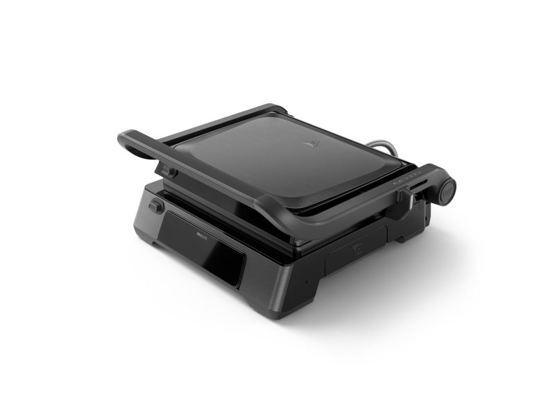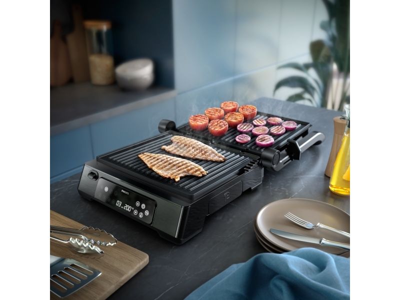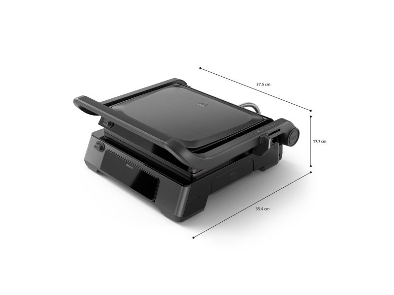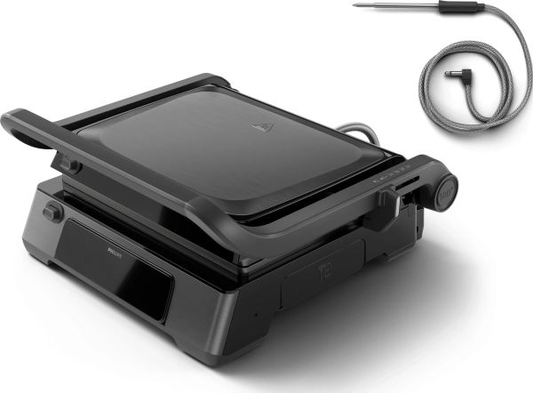 The Philips 7000 series HD6307 grill offers a cooking experience with features designed for convenience and versatility. The grill is equipped with non-stick cooking plates for easy cleaning and includes a removable drip tray that helps keep kitchen surfaces tidy. Enjoy perfectly cooked meals with the adjustable temperature setting and the integrated meat probe thermometer, ensuring that meat is cooked according to taste and preference.