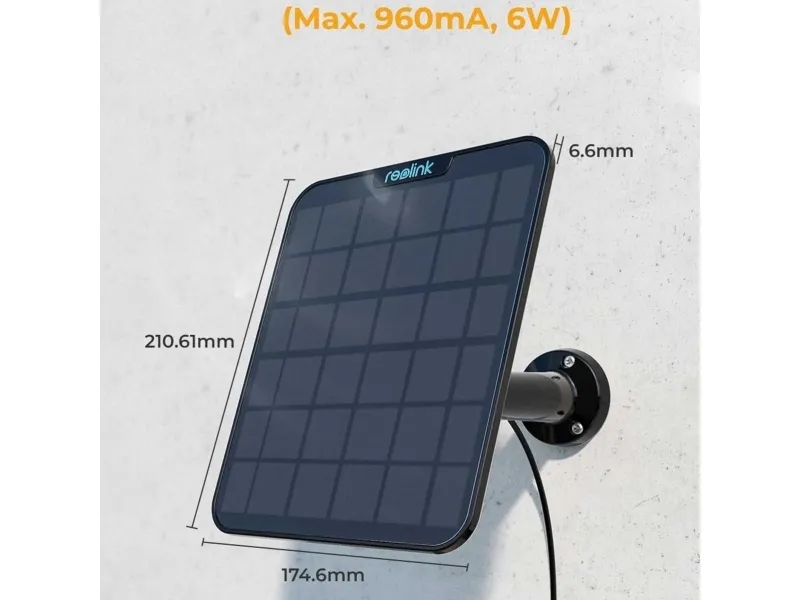 Brand- Reolink. Model- Solar Panel 2. Colour- Black. Length- 174.6 mm. Height- 210.6 mm. Width- 185 mm. Connections- USB. Power- 6 W. Water resistance- Yes. Additional information- Solar panel for Reolink surveillance cameras.