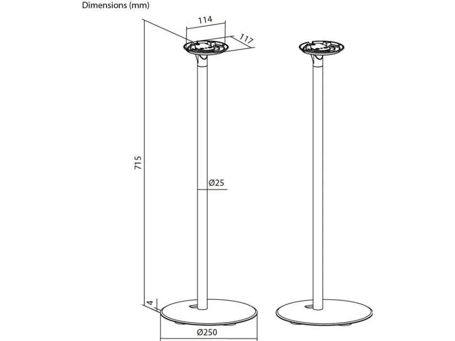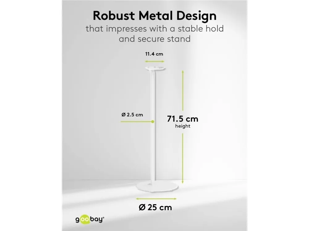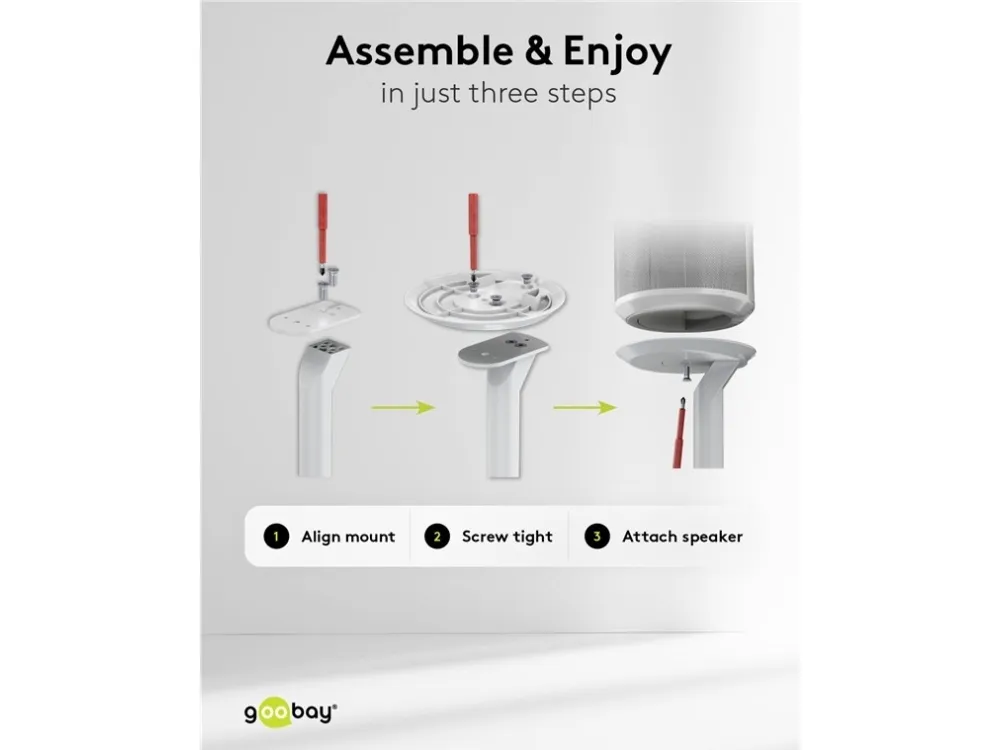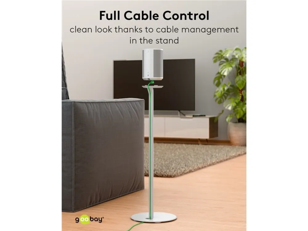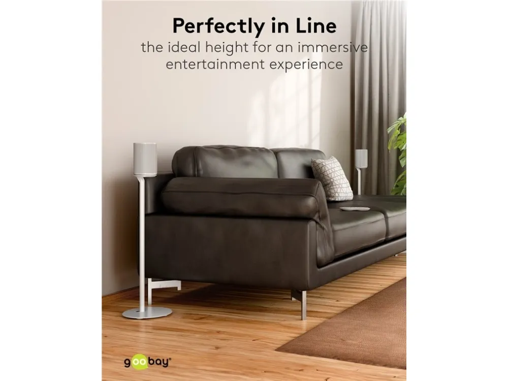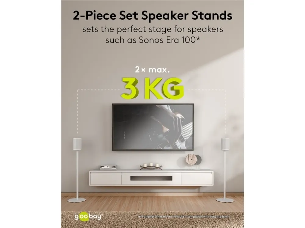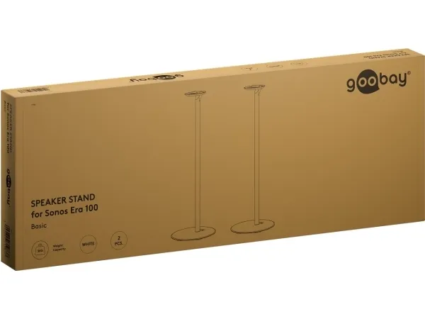 compatible with the Sonos Era 100 Speaker mount made of robust metal for securely mounting satellite speakers weighing up to 3 kg Compatible with speakers such as the Sonos Era 100 At 71.5 cm, the speaker stands are just the right height for an excellent listening and music experience while seated – on the sofa, at the desk or on the patio The cable management is discreetly concealed in the base for a clean look without cable clutter With cable feed-through for conveniently connecting and disconnecting audio and mains cables The speaker is quickly and easily fastened to the stand using screw mounting