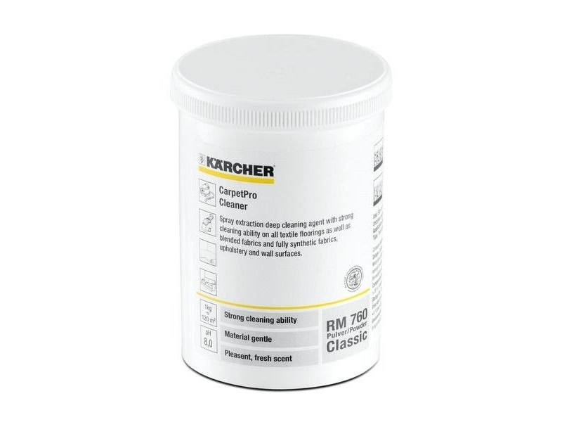 - classical basic cleaning powder for spray-extraction of textile floor covering and upholstery - removes oil, fat and dust - gently to all materials - completely effective in cold water - improves floor hygiene - bleac-free - particularly developed for Kärcher spray-extraction cleaners