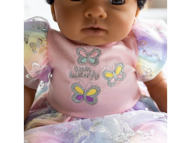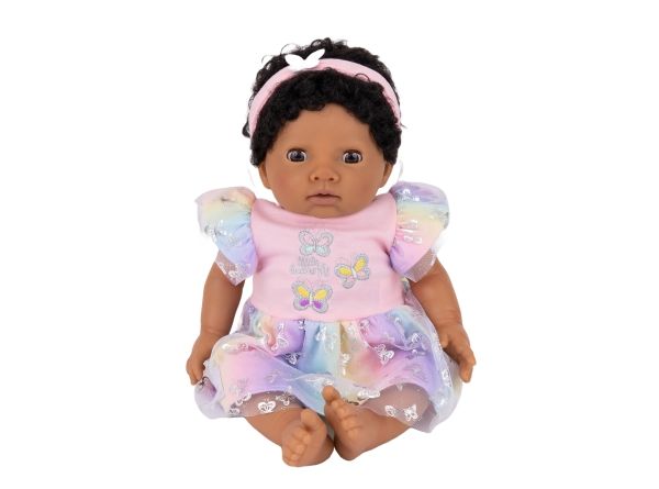 Tiny Treasures Ethnic Doll with black curly hair and Butterfly Rainbow dress. The doll looks and feels like a real baby. 44 cm and 1190g. 3+ år