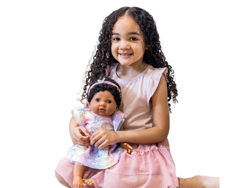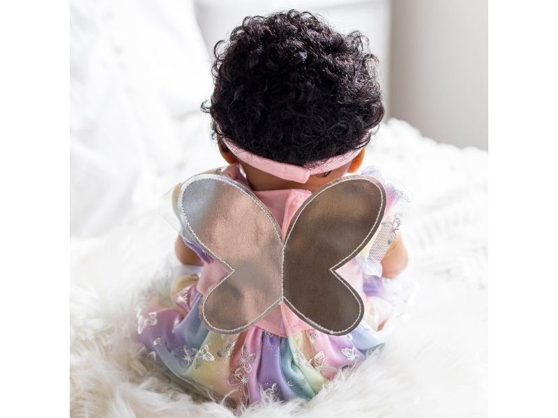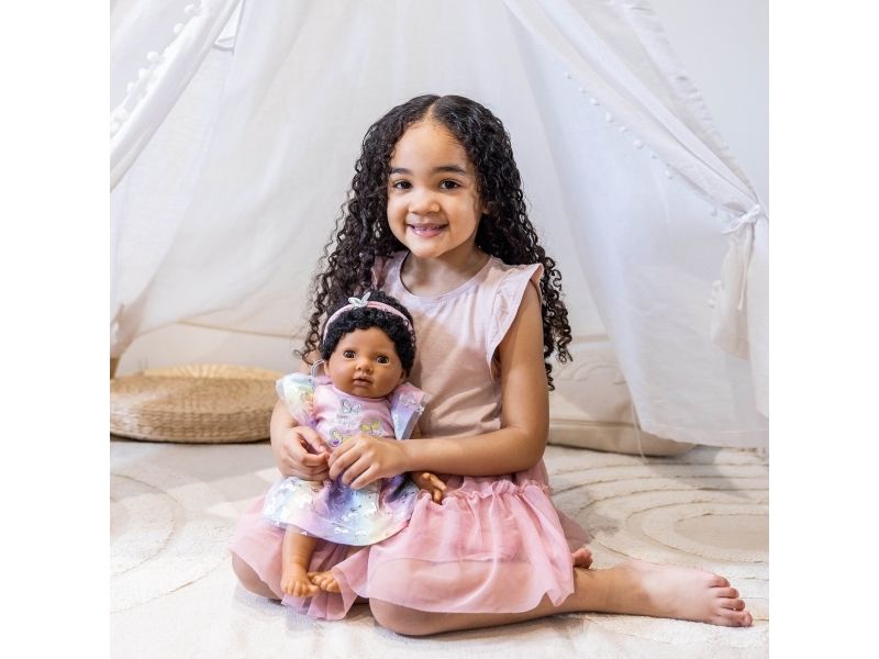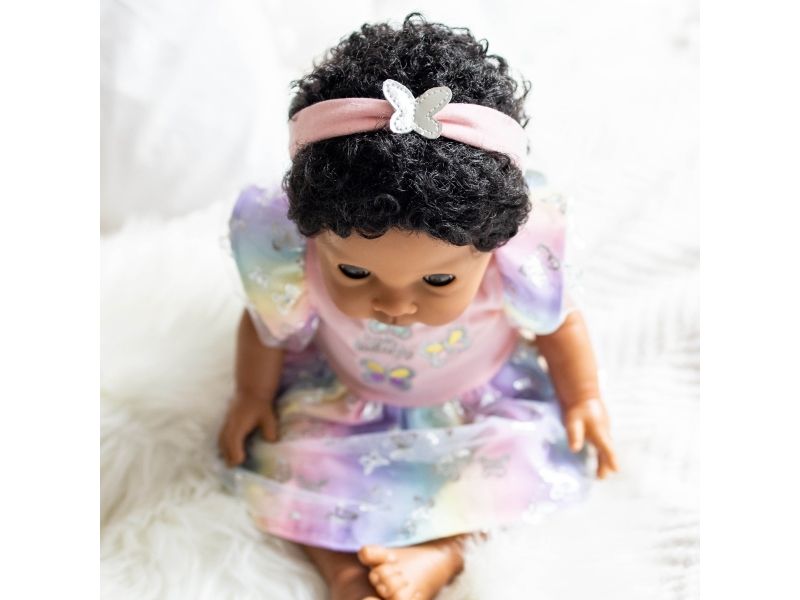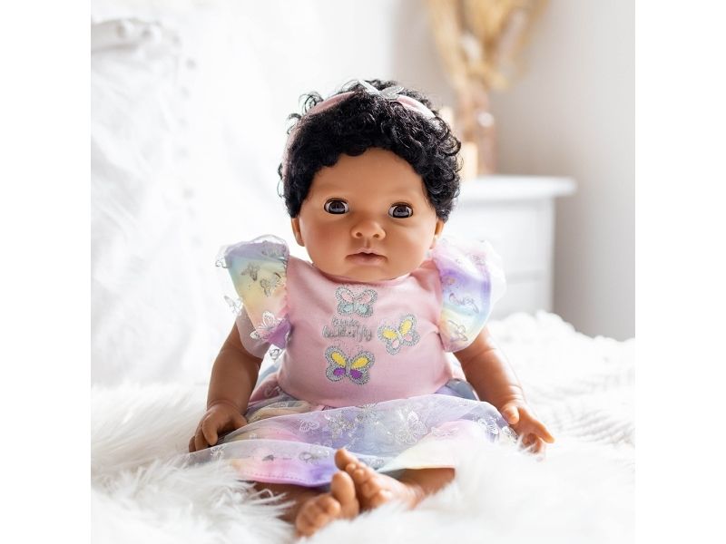 Tiny Treasures Ethnic Doll with black curly hair and brown eyes. The Cute Doll is wearing a rainbow-coloured dress with butterfly print. The dress has short sleeves and cute butterflies’ embroidery on the front chest.
