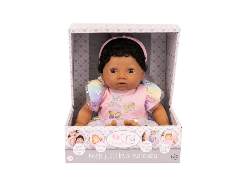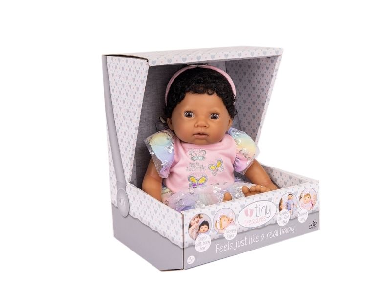 The doll’s eyelids close when you put the doll down to sleep and have jointed limbs for realistic movement and Hand painted features and soft baby hair. Tiny Treasures dolls weights more than other dolls, and it feels like holding a real baby. The dolls weigh 1190g and measure 44 cm. The Doll comes in a car seat style box with real straps adding even more fun to your pretend parenting playtime.