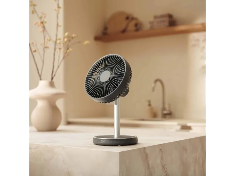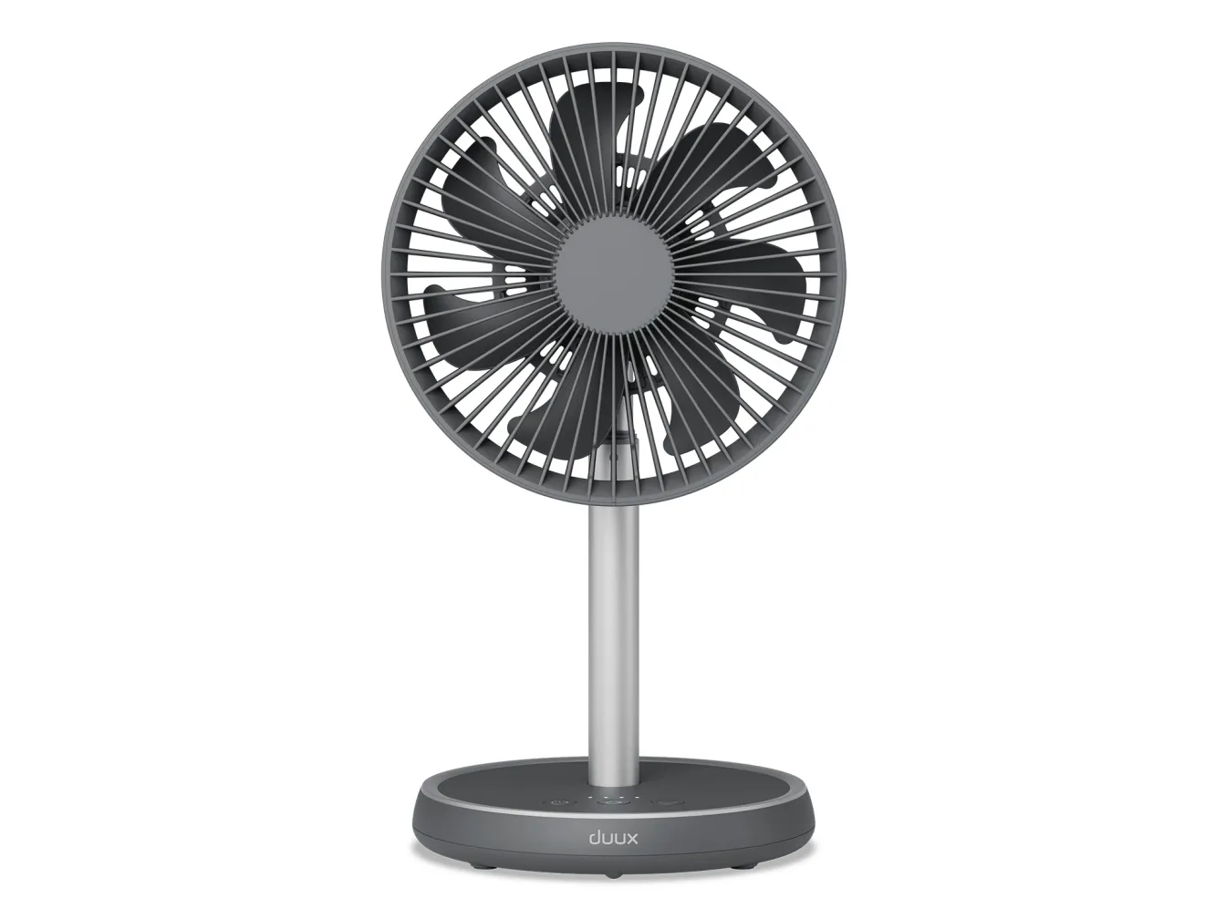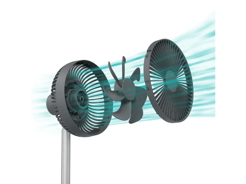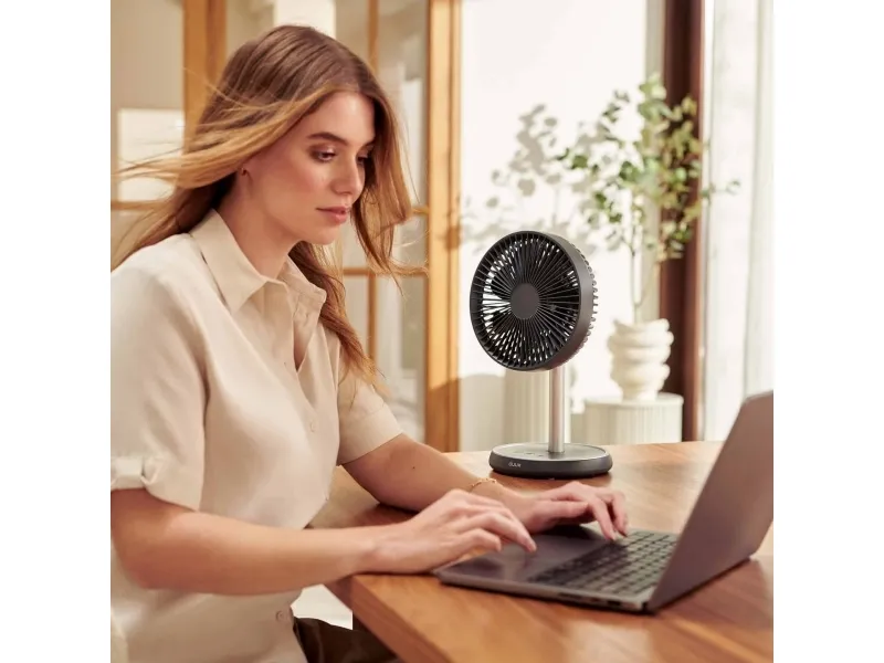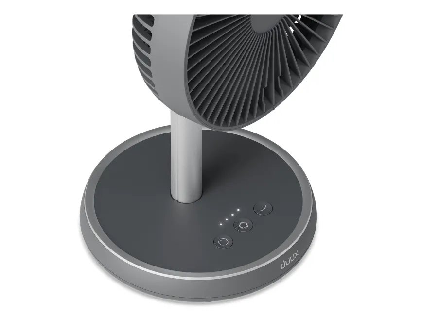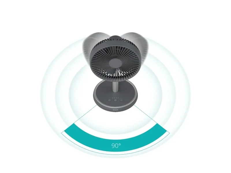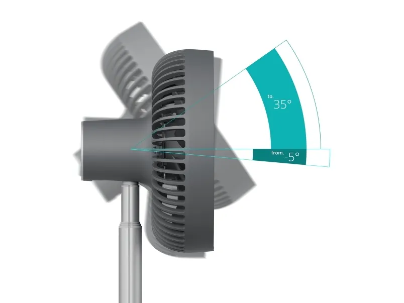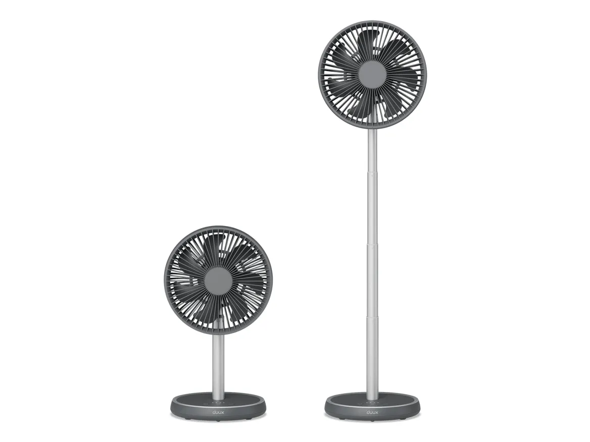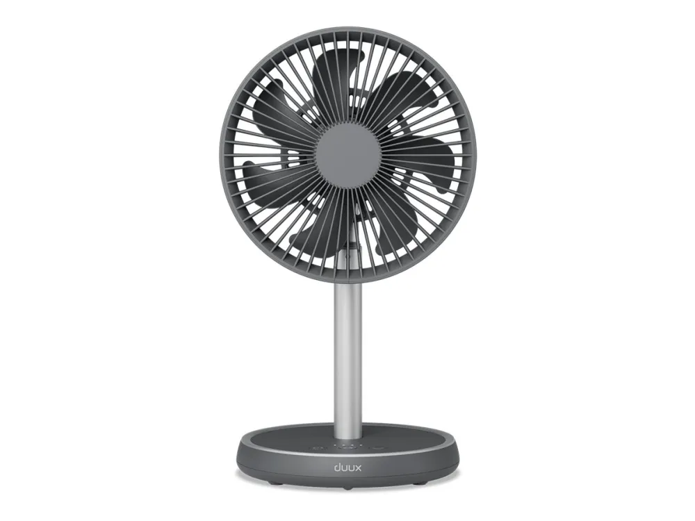 Experience efficient cooling with the Duux DXCF90 cooling fan, designed for versatility in any environment. This table-top and floor-standing fan features an adjustable height, allowing users to customize airflow based on their needs. With 7 blades and an airflow capacity of 450 m3/h, the fan delivers a refreshing breeze efficiently, whether indoors or outdoors. The DXCF90 provides user-friendly operation with four speed settings and convenient controls. It features a 90° oscillation and a 35° tilt adjustment, enabling targeted cooling in various directions. Additionally, with a 4000 mAh battery capacity, this fan can recharge in 4 hours, offering reliable portability and flexibility while maintaining a low sound pressure level of 45 dB for a peaceful environment.