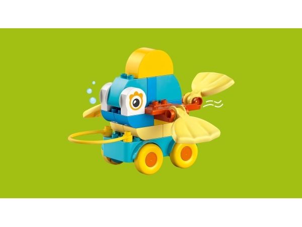 Boost toddlers’ creativity with the 3in1 Animals on Wheels (10448) building toy. Little animal lovers will find countless ways to enjoy imaginative play as they build the duck, fish or dog toy for preschool kids, or even create all-new animals! Preschool kids who love LEGO® DUPLO® vehicle toys build their figures on a wheelbase and can enjoy sending their animals zipping along or pulling them along with the handle. This gift for toddlers has moving features such as a flexible tail piece and hinged toy elements that will appeal to toddlers’ sense of fun while honing their fine motor skills. Little ones use their focus, perseverance and imagination as they endlessly build and rebuild their creative toy animals. This toddler toy has many playful learning moments. This 3in1 LEGO DUPLO set comes with easy-to-handle blocks that are simple to pull apart, making it straightforward for toddlers to learn how to balance the wheelbase to save their creation from tipping over. Contains 58 pieces.