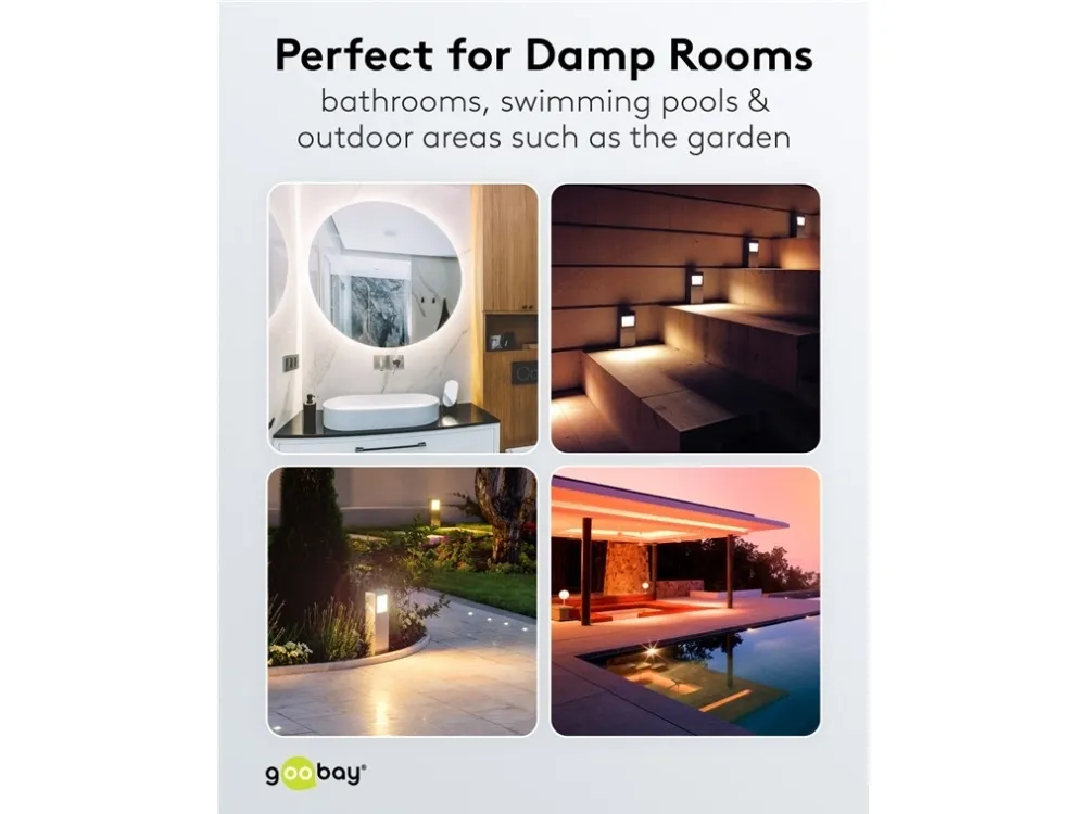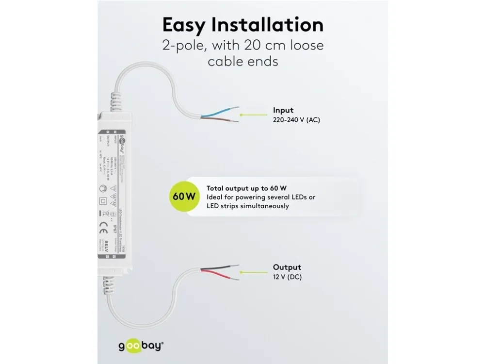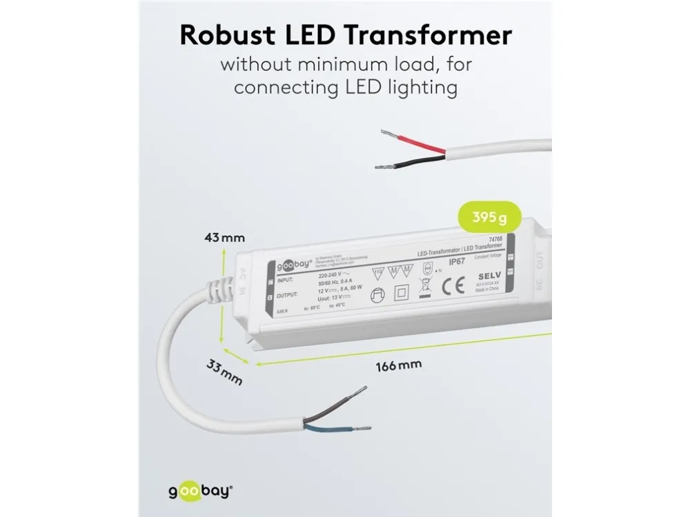 constant voltage transformer (CV) for outdoor use, not dimmable Robust LED transformer without minimum load for connecting lamps such as G4 or GU-5.3 LED spots, LED strips and LED modules to the 220-240 V (AC) power grid The constant voltage of 12 V (DC) allows for the flexible addition and removal of individual LEDs in parallel circuits and variable lengths of LED strips With an IP67 rating, the LED driver is perfect for outdoor use, e.g. for outdoor lighting, surveillance systems, humid rooms such as bathrooms or kitchens and industrial humid rooms Ideal for powering multiple LEDs or LED strips simultaneously with a total output of up to 60 W Input and output of the 12 V LED transformer each with 20 cm loose cable ends (2-pole) for easier installation The LED driver 12 V is particularly safe due to overvoltage and short-circuit protection as well as electronic separation according to protection class II Dimensions (L x W x H): 166 x 43 x 33 mm, Note: The LED transformer is not dimmable