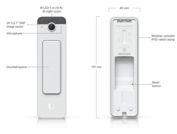 The Ubiquiti UniFi Doorbell Lite is designed to enhance home security with its integrated camera, speaker, and buzzer functionalities. This doorbell offers a weatherproof design, ensuring reliable performance in diverse environmental conditions, with operational temperatures ranging from -30°C to 50°C and humidity levels from 20 to 90%. With Power over Ethernet (PoE) capabilities, the device simplifies installation by eliminating the need for separate power sources, while its two-way audio support allows for interactive communication with visitors. Featuring a 5 megapixel camera with infrared night vision, sharpness control, and digital noise reduction, the Doorbell Lite delivers quality video footage day or night, offering peace of mind to homeowners. The construction from metal and polycarbonate materials adds to the device's reliability and longevity, making it an addition to any smart home system.