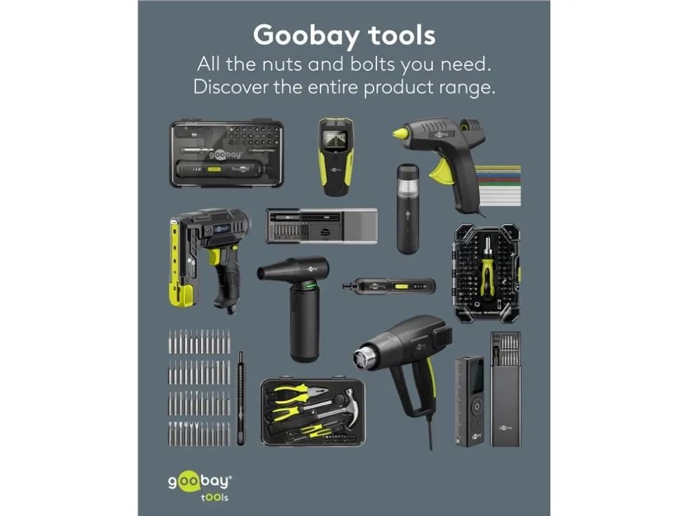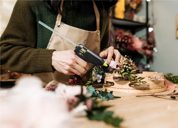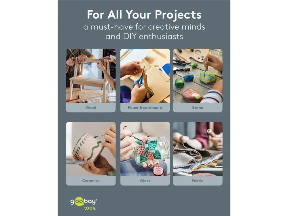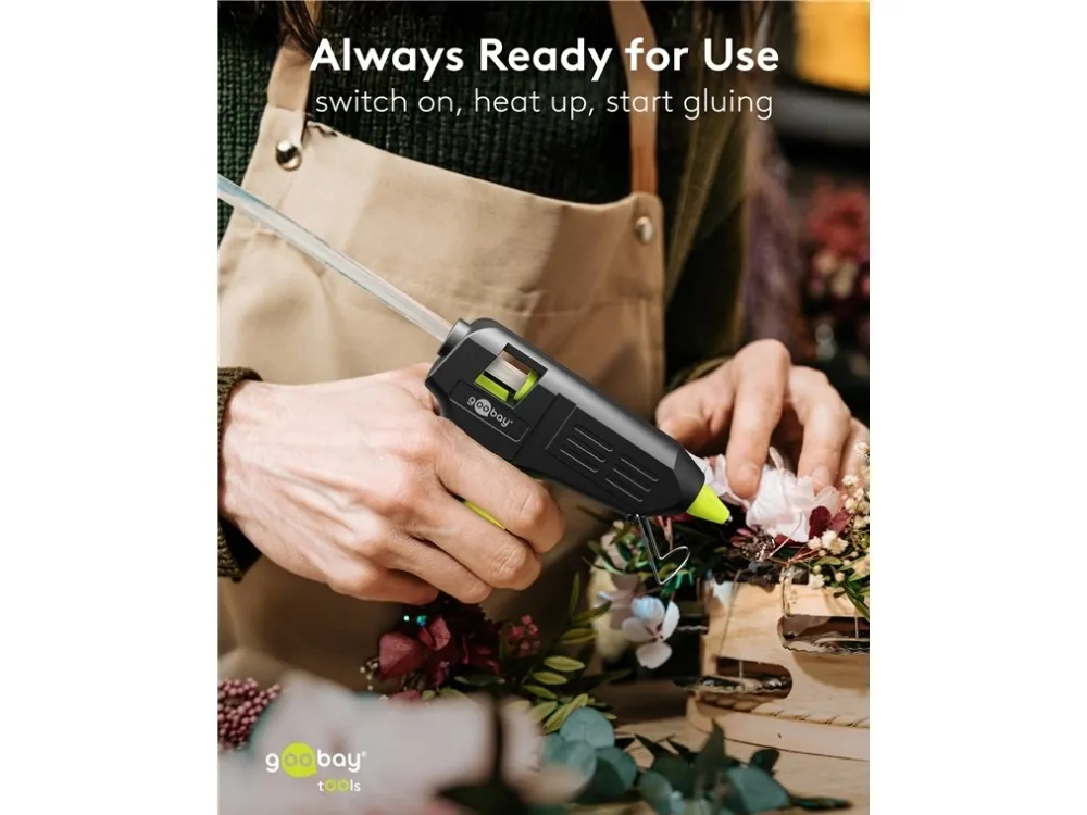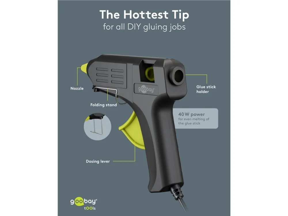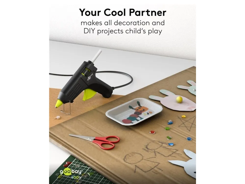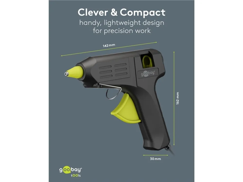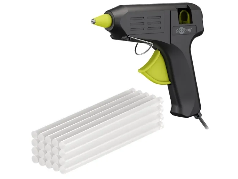 for hot glue sticks with a diameter of 11 mm Glues materials quickly and reliably together: Compact hot glue gun for all gluing jobs when crafting, decorating or repairing Easy dosing and precise application: Due to the mechanical feed of the glue gun, you can apply the liquid glue evenly and in measured doses (16 g/min) Versatile: The hot glue gun sticks are suitable for numerous materials, e.g. cardboard, ceramics, wood, metal, leather, acrylic and glass Convenient fold-out stand: The heated hot glue gun stands firmly and securely on the fold-out stand, preventing burn marks on tables, work mats or other surfaces Reduced risk of burns: Thanks to the heat protection cap, the heated metal nozzle protrudes only minimally from the gun to ensure increased safety during use Power supply via mains cable with Europlug, voltage range 110-240 V (AC), cable length 1 m