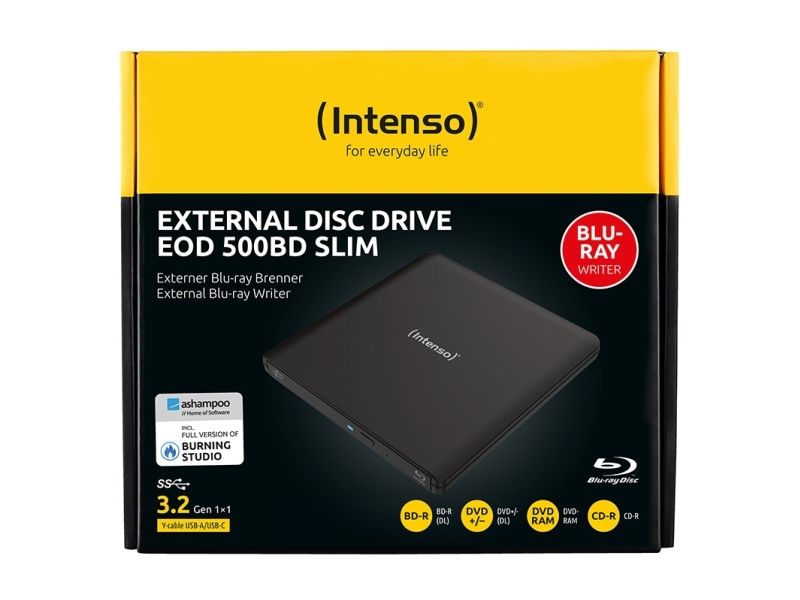 Fully equipped. User-friendly. The package includes a Y-cable (Micro-B to USB-C and USB-A) as well as the full version of Ashampoo Burning Studio software for easy data backup, media creation, and archiving. Its slim design (142 × 148 × 16 mm) and lightweight build of only 250 g make the EOD 500BD Slim especially portable. With modern technology and a durable aluminum case, it’s the perfect solution for professional data storage and high-quality media playback.Intenso EOD 500BD Slim. Product colour: Black, Disc loading type: Front. Purpose: Desktop/Laptop, Optical drive type: Blu-Ray ROM, Interface: USB 3.2 Gen 1 (3.1 Gen 1). DVD+R write speed: 8x, CD-R write speed: 24x, BD-R write speed: 6x. Width: 148 mm, Depth: 16 mm, Height: 142 mm. Package weight: 400 kg, Package width: 174 mm, Package depth: 198 mm