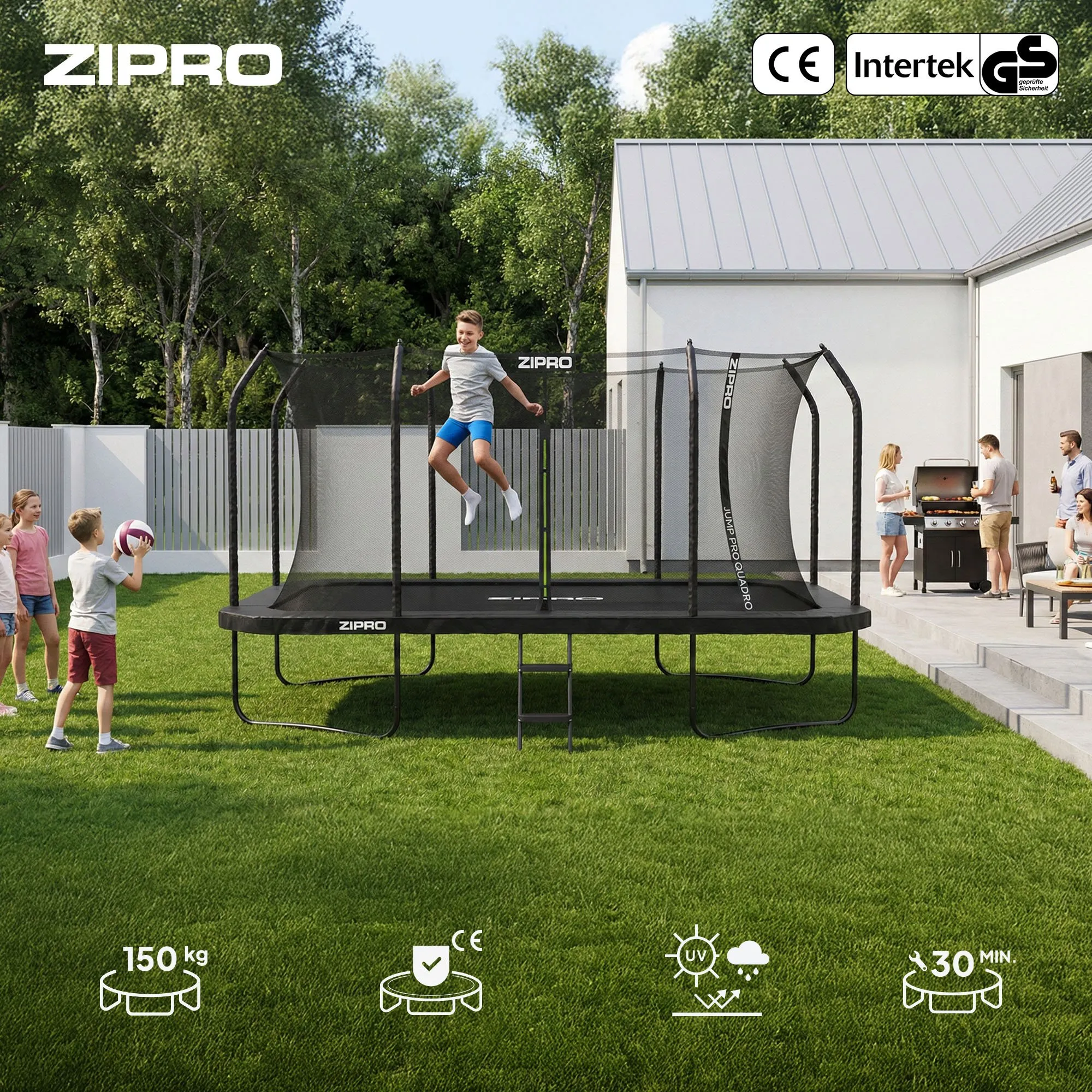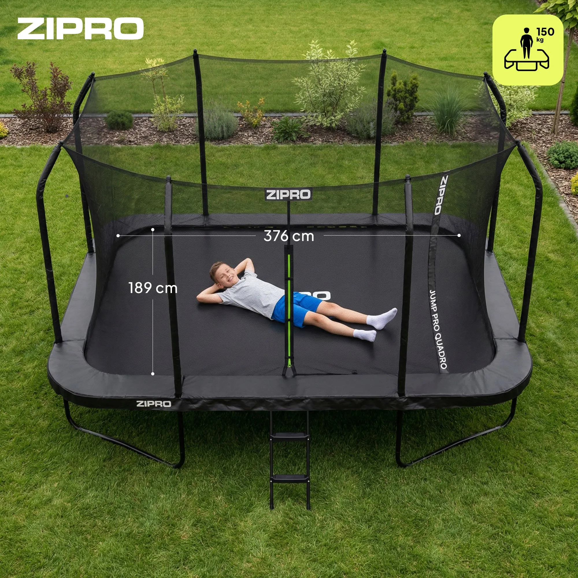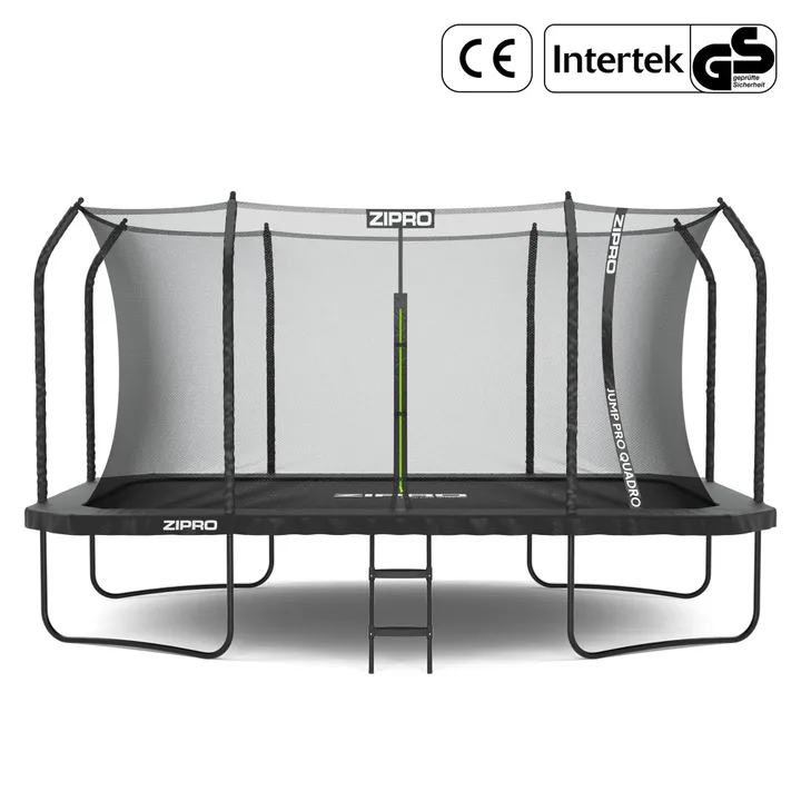 Træn og hav det sjovt som i en professionel trampolinpark Er kraftfulde afsæt og alsidige træningsmuligheder vigtige for dig? En rektangulær trampolin er den helt rigtige løsning til dig! I ZIPRO QUADRO-modellen arbejder hver fjeder uafhængigt, hvilket giver mulighed for mere intens hop end i de runde varianter. Den jævne spænding af hoppemåtten forhindrer "indtrækningseffekten" i midten, så hele overfladen kan udnyttes – præcis som i professionelle gymnastiksale.
