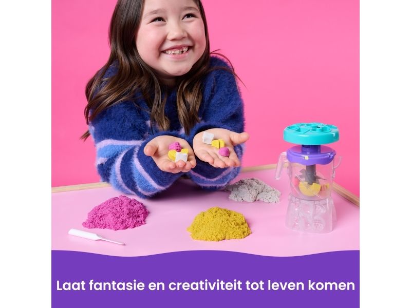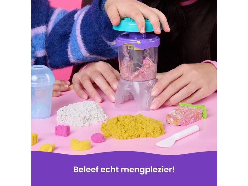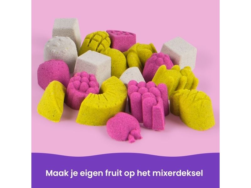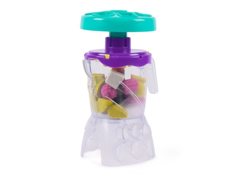 Make fruity treats with the Kinetic Sand Smoothie Mixer. With this fun set, kids can mold, layer, mix, slice and squish their own smoothies and popsicles, sparking creativity and imagination. Kids will experience real blending action as they mold fruit and toppings on the lid, drop ingredients into the jar and press to mix, just like a real mixer. With 14 oz play sand, "pour" smoothie creations into the cup to serve, or layer sand into the popsicle mold for a tasty-looking treat. Kinetic Sand aids in the development of fine motor skills and sensory skills, and is suitable for individual or group play, encouraging social interaction. A must-have gift for birthdays, holidays, or any occasion, Kinetic Sand is an engaging craft kits alternative to modeling clay and building toys. Kinetic Sand sets can be used as a learning resource in classrooms, as Montessori toys or for playtime at home. The One and Only Kinetic Sand is made from natural sand, never dries out, and sticks together for easy cleanup. Get your hands in the sand with more colors of Kinetic Sand and discover additional playsets (each sold separately). Experience real blending action with the Kinetic Sand Smoothie Mixer.
