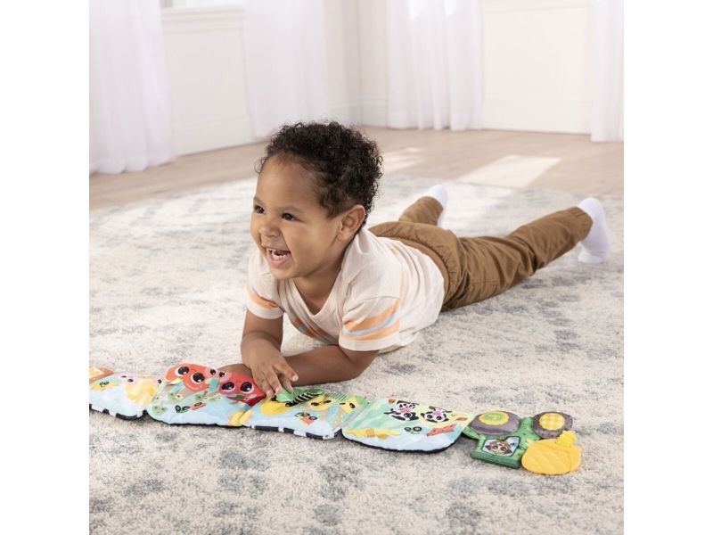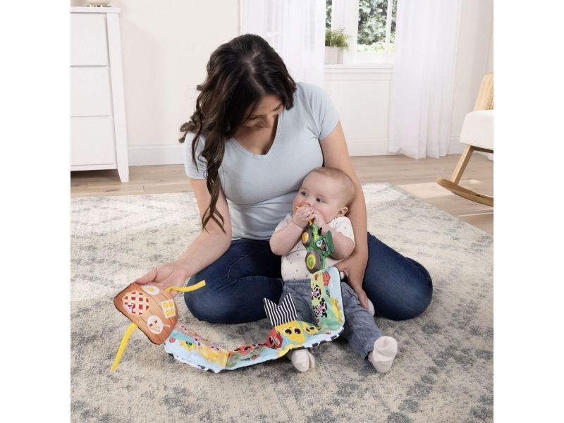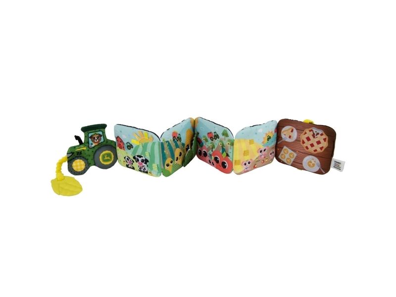 Tasty travels await both you and your baby with Lamaze’s John Deere Farm to Table Journey discovery toy. Whether exploring the open pages on the floor or sitting with baby in a chair, this accordion style picture book features two sides of fun you can share with your little one. Unfold it and discover a high-contrast side, great for younger babies, with black-and-white illustrations and a simple farm theme with different textures that are designed to stimulate visual development. Flip to the other side to find bright colors, squeaking pigs, friendly farm scenes, and even corn cobs playing peek-a-boo! The engaging ribbons are great for grasping which encourages tactile development. Each page features something fun to discover. When you’re done sharing fun farm scenes with baby, it folds back up and stays closed thanks to two ribbons with Velcro closure.