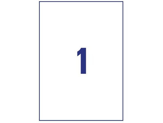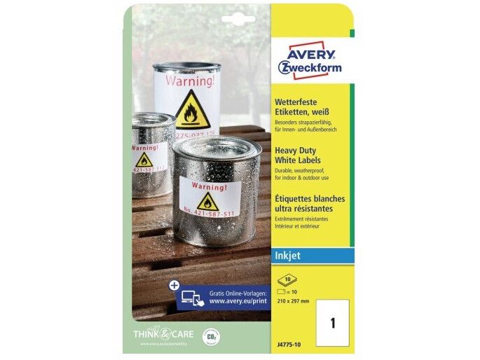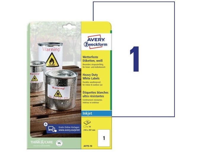 Avery's J4775-10 hvide stærke etiketter har 1 etiket/ark og 10 etiketter/pk, hvor hver etiket måler 210 x 297 mm. Etiketternes størrelse er velegnet til store genstande og som skilte.