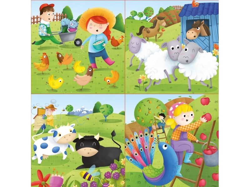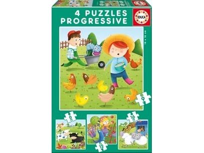 Each box contains 4 puzzles with a different number of pieces each (between 6 and 16) for children to try increasingly difficult puzzles as they grow and learn to put puzzles together. Size of each assembled puzzle: 16 x 16 cm.