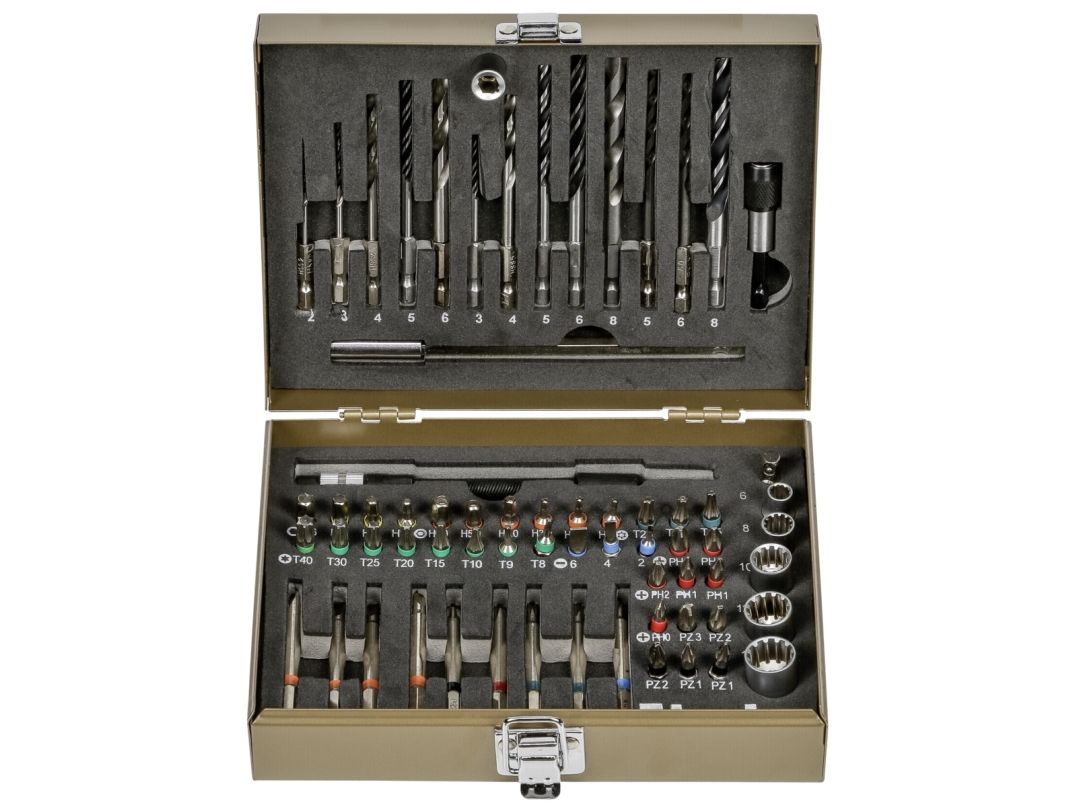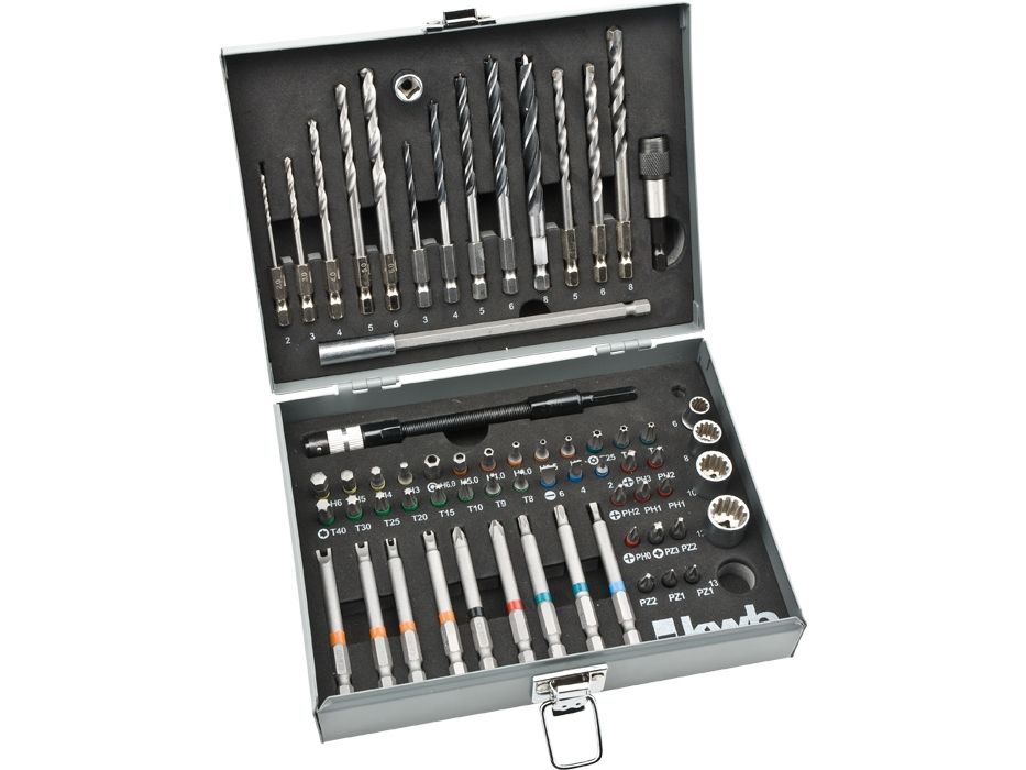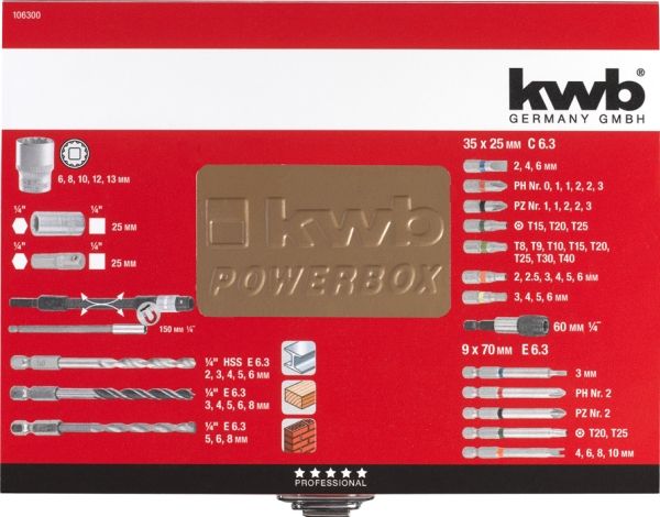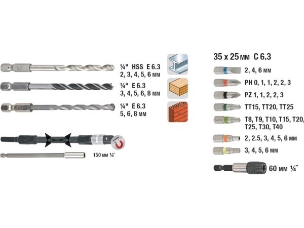 Power Box STANDARD, bits drive 1/4" hexagon to ISO 1173, C 6.3 and E 6.3, quick-change holder with permanent magnet, shaft 1/4" Hexagon to ISO 1173, E 6.3, with color identification rings, stone, metal, wood drill bit with hexagonal shank 1/4", CV sockets with Gear-profile, 2 long bit holder, in a rigid metal case.
