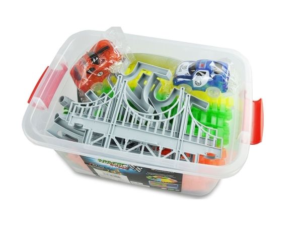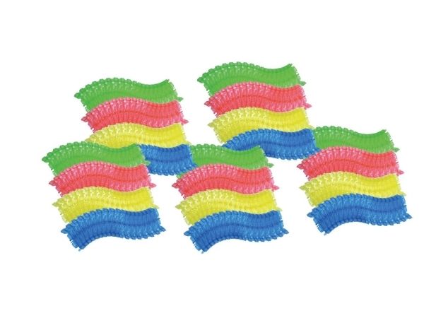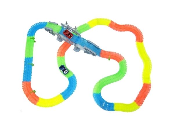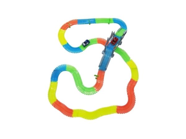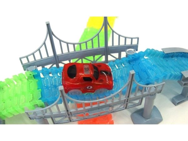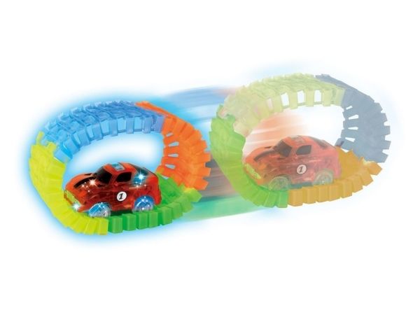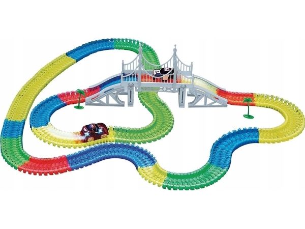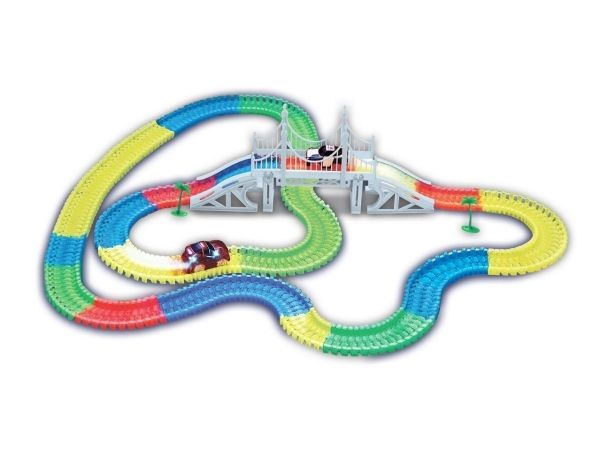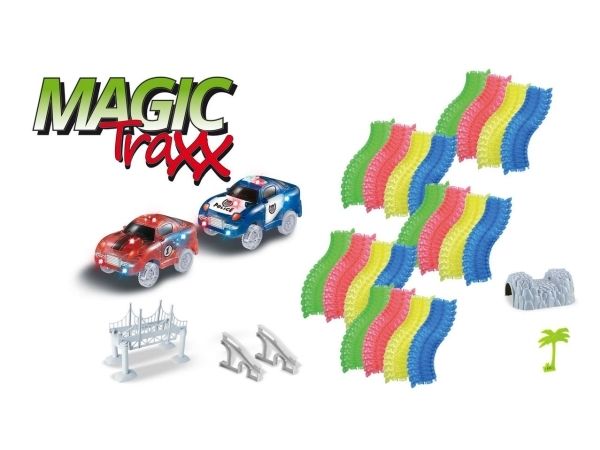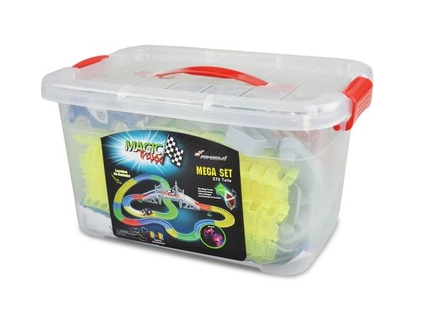 BESCHREIBUNG Bau dir deine eigene Rennstrecke wie du sie haben willst! Mit dem großen Set von Magic Traxx ist das kein Problem! Die Schienen sind flexibel und lassen sich auch während des Betriebes beliebig verschieben und verformen. Forme Brücken und Kurven immer wieder neu. Die hell beleuchteten Autos und die reflektierenden Schienen sorgen dabei auch im Dunkeln für mehr als ausreichende Sicht um deiner Phantasie freien Lauf zu lassen. In diesem Starter Set mit insgesamt 373 Teilen ist alles enthalten, was du für den Start benötigst. Durch zusätzliche Autos oder komplette Packs kannst du dein Set nach deinen Wünschen erweitern - alles kein Problem! Alle Magic Traxx Artikel sind miteinander kombinierbar. Mit dem beiliegenden Aufkleber Set kannst du deine Rennwagen ihr eigenes Aussehen verpassen und sie so unverwechselbar "designen". Mit den im Set enthaltenen Zubehörteilen wie Brücke, Bögen und Bäumen kannst du deine Rennstrecke super gestalten.