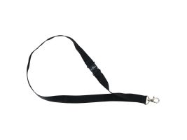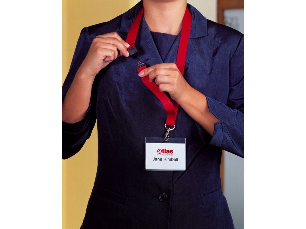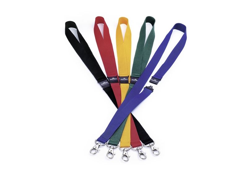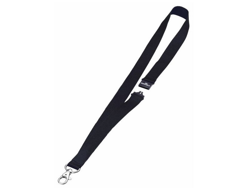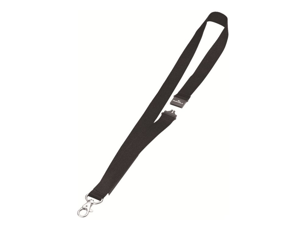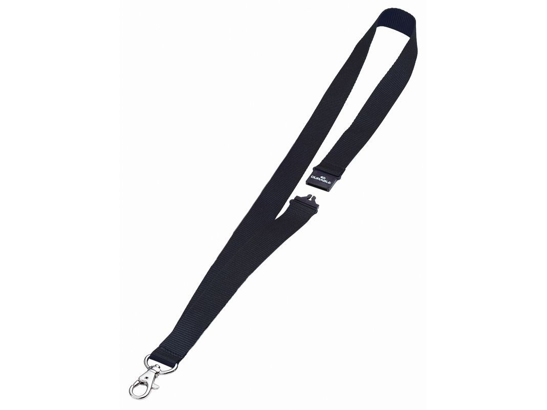 - The 20mm wide textile badge necklace with safety release can be combined with all DURABLE name badges that have a clip cut out. - The safety-release opens if the badge necklace gets trapped or caught. - Length: 44 cm.