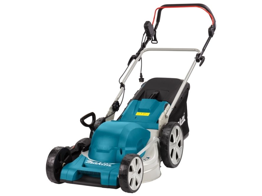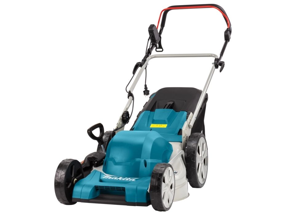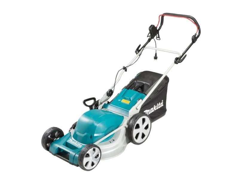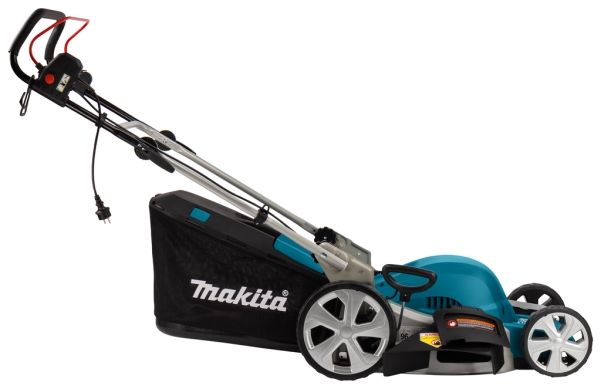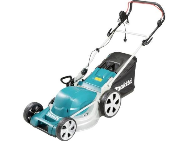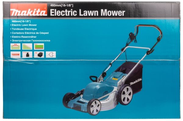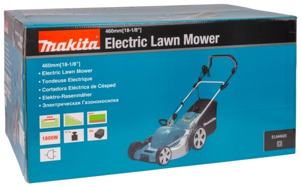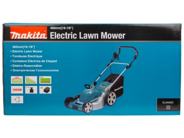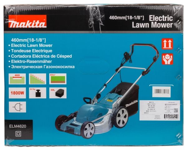 Makita ELM4620. Maximum lawn area: 800 m², Cutting width: 46 cm, Minimum cutting height: 2 cm. Power source: AC, Power: 1800 W, AC input voltage: 230 V. Width: 570 mm, Depth: 1700 mm, Height: 1165 mm