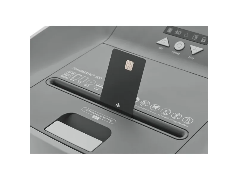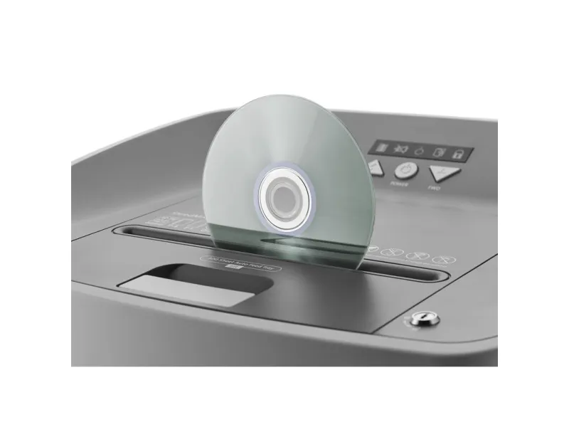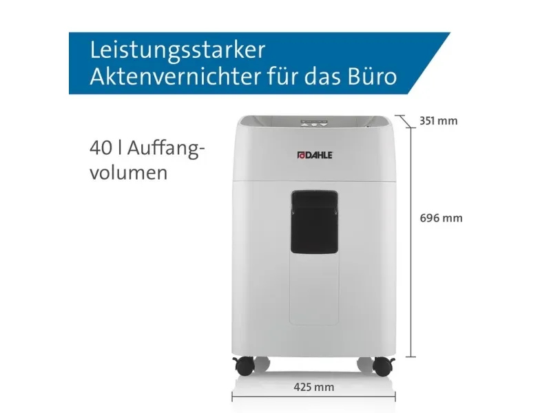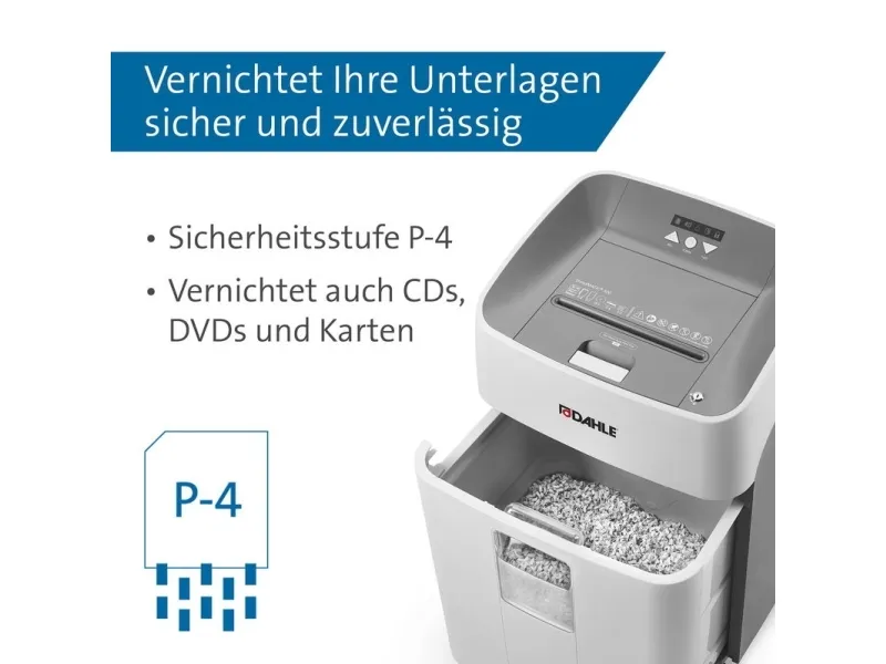 The Erwin Müller Dahle ShredMATIC 35314 is an efficient cross-cut shredder designed to provide secure document disposal. This model features a 40-liter capacity, allowing users to handle larger quantities of paper without frequent emptying. With a maximum shredding capacity of 14 sheets at a time and a shred size of 4 x 15 mm, security is ensured through a P-4 security level, making it suitable for confidential materials. It also has the ability to shred CDs, credit cards, DVDs, and paper clips, making it a versatile addition to any office environment. Equipped with a 300 sheets automatic feeder, the Dahle ShredMATIC 35314 reduces the time and effort required for shredding large volumes of paper. It operates at a speed of 2.5 m/min, improving productivity without sacrificing safety. The auto start and stop functions provide convenience, while the motor reverse capability aids in preventing jams. With a sound emission level of 60 dBA, this shredder operates quietly, making it ideal for shared workspaces. Compliance with TUV and GS standards enhances its credibility as a reliable office tool.