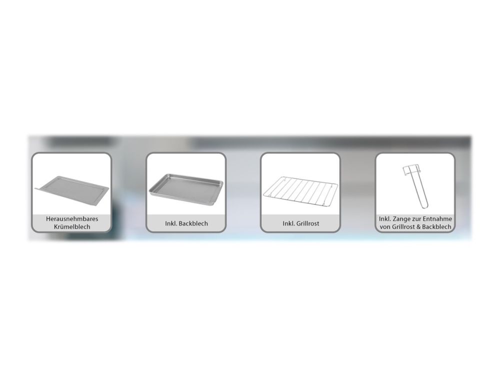 Inklusive — Im Lieferumfang enthalten: Grillrost, Backblech, Zange zur Entnahme, Krümelblech.