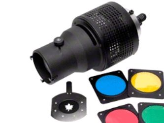 (1) x mønsterprojektorobjektiv - Walimex Optical Snoot (1) x filter til illuminering - blå (1) x filter til illuminering - rød (1) x filter til illuminering - gul (1) x filter til illuminering - grøn (1) x skabelonark - hjerte (1) x skabelonark - vindue (1) x skabelonark - måne (1) x skabelonark - blad
