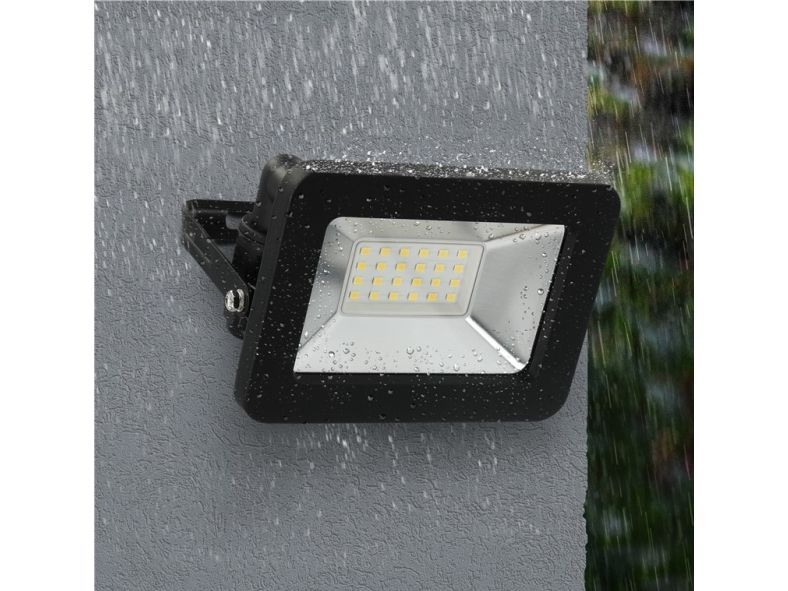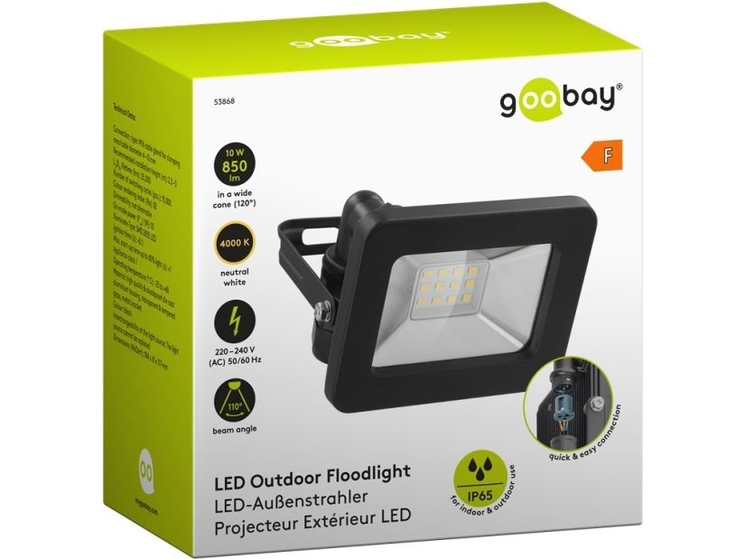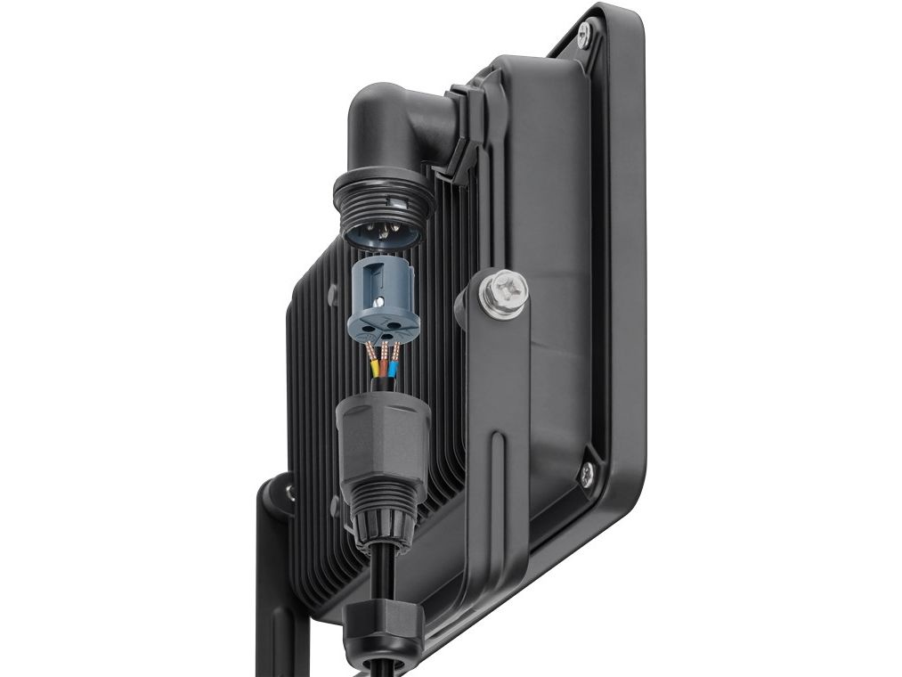 with 850 lm, neutral white light (4000 K) and M16 cable gland, suitable for outdoor use (IP65) Very bright and functional LED outdoor lights in a compact size for lighting garages, carports, facades and access paths Quick and easy mounting thanks to the practical M16 cable gland with plug-in function for a clamping range or cable diameter of 4-10 mm LED flood light with large 110° beam angle is ideal as a garden light or for illuminating facades. Stable, angled mounting bracket for wall mounting or attachment to a tripod with a rotation range of up to 180° LED flood light with high-quality and shockproof die-cast aluminium housing, transparent and tempered glass especially suitable for construction sites LED floodlights lower energy consumption by up to 80 % compared to halogen floodlights. Can also be used as a garden spotlight