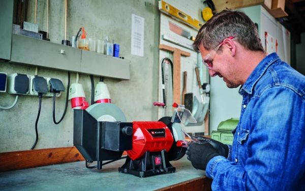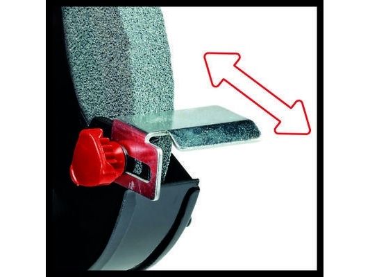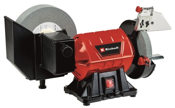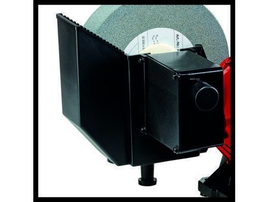 The Einhell TC-WD 200/150 wet-dry grinder is a practical combination which can be used for wet and dry grinding/sanding, making it ideal for DIY enthusiasts. The grinder can be used for sharpening blades of all kinds, drill bits, scissors or knives. The robust compact metal construction ensures that the grinder has a long service life and the large water tank is made of corrosion-resistant material. Large adjustable work supports are a help for a wide range of applications, while the ball bearing mounted shaft with zero play makes it possible to achieve precise results. For safety there is a spark guard window which can be adjusted without any tools, plus guard hoods which are closed at the sides. Four rubber feet absorb vibrations and ensure a secure and steady standing position in operation. The product is supplied complete with a coarse grinding/sanding wheel and slow-speed, fine-grained wet grinding/sanding wheel.