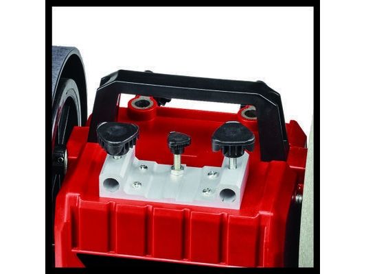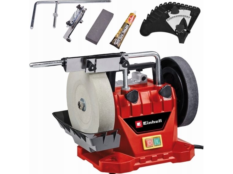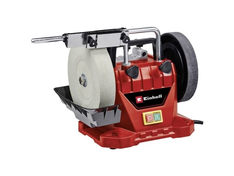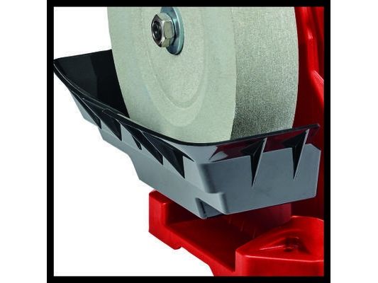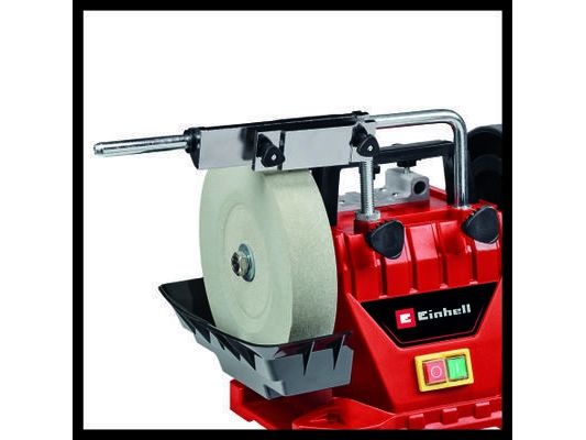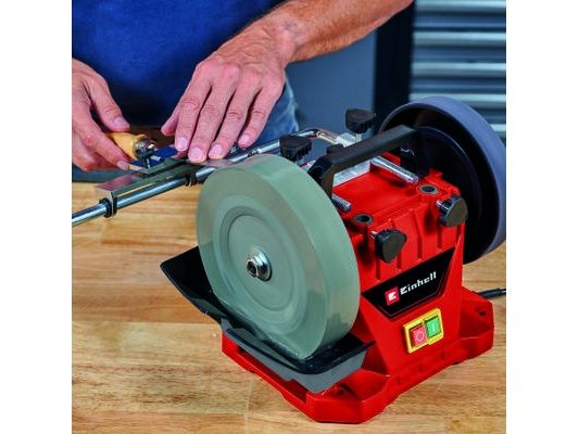 The Einhell TC-WG 200 wet grinder is ideal for sharpening your tools without damaging the workpiece being worked on. Water is slowly supplied to the blade during grinding, which prevents frictional heat and the wheel becoming glowing hot. The universal device provides flexibility for grinding a wide range of tools and the corrosion-resistant water tank cools the piece. Honing compound can be used for polishing the workpiece. The angle gauge for adjusting the grinding angle is included in the delivery. The grinding wheel can be prepared using the grinding stone. Four rubber feet absorb vibrations and ensure a secure and steady standing position. The product is supplied complete with a slow-turning, fine grained wet grinding wheel and a leather honing wheel for removing grinding burrs.