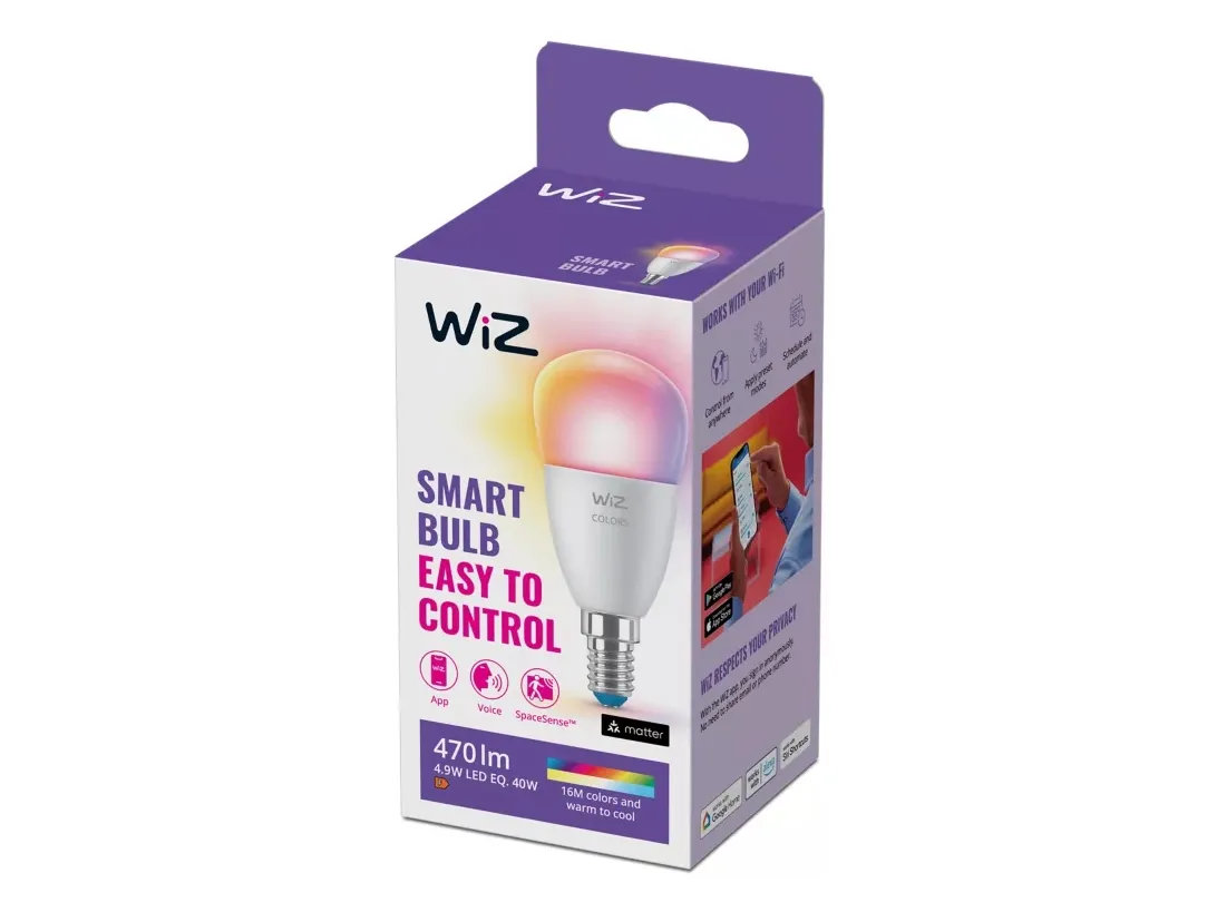 WiZ Bulb 40W P45 E14. Type: Smart bulb, Product colour: White, Fitting/cap type: E14. Energy efficiency class: F, Energy consumption per 1000 hours: 5 kWh, Input voltage: 220-240 V. Width: 45 mm, Depth: 101 mm, Height: 10.1 mm. Package width: 7 mm, Package depth: 7 mm, Package height: 16 mm. Quantity per pack: 1 pc(s)