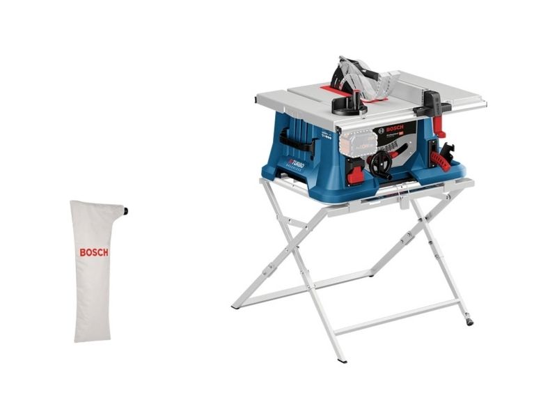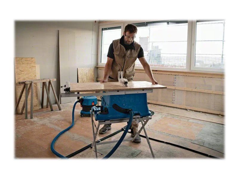 Støvpose, rivehegn, savklinge til træ, geringsgauge, skubbepind, Bosch GTA 2600 Professional arbejdsbænk, klingeværn, DeWALT DE7023 geringssavstander