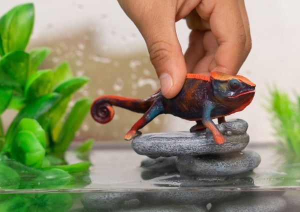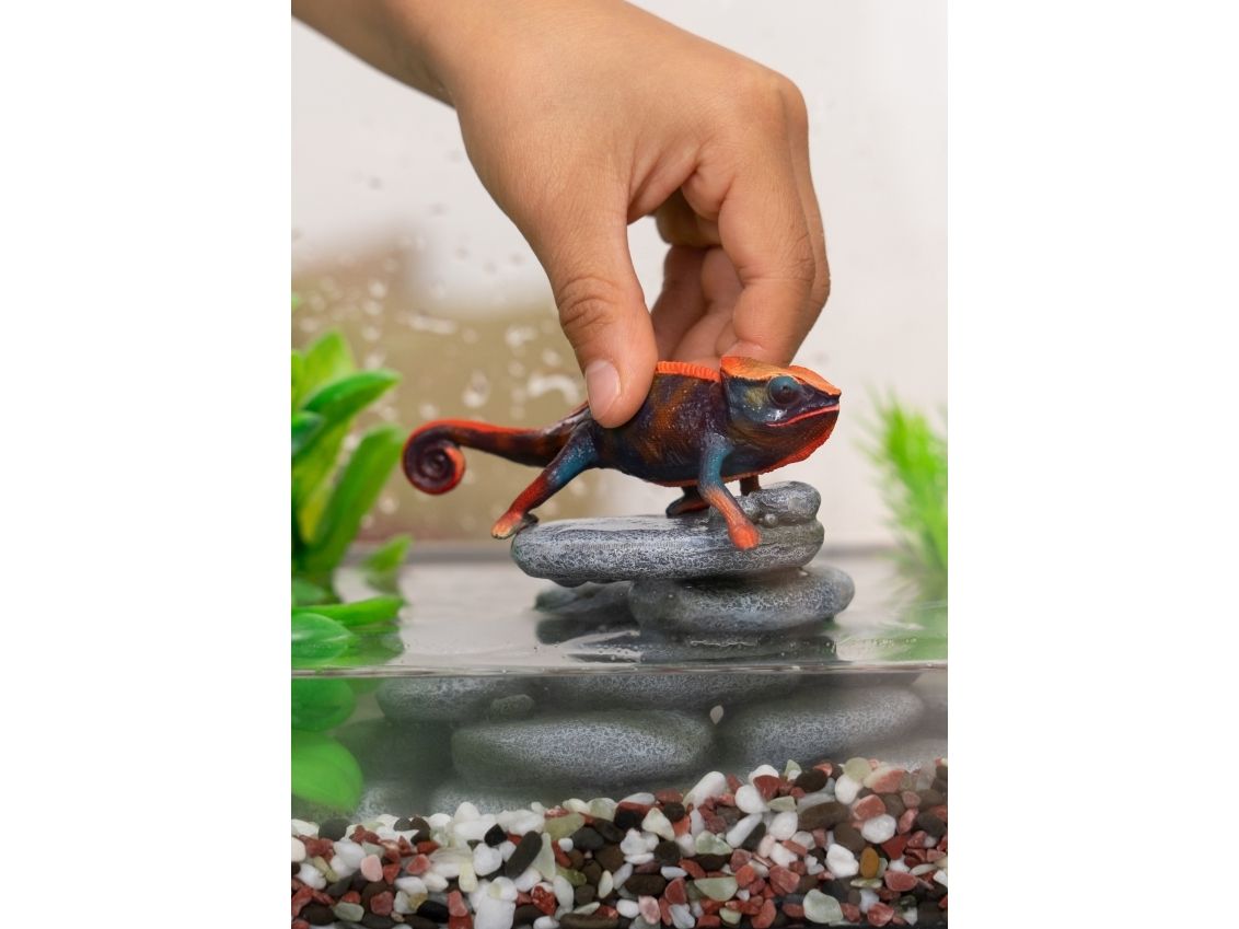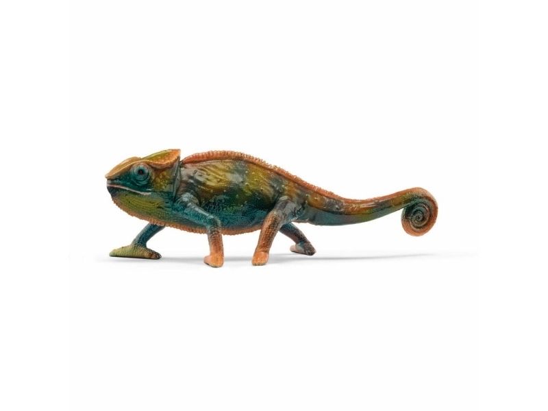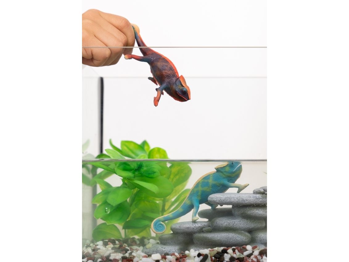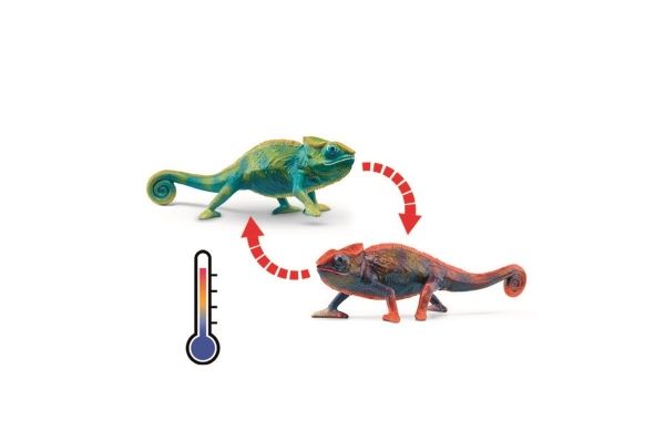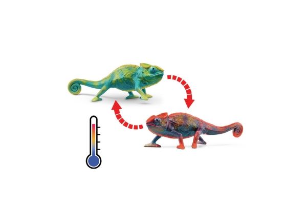 The chameleon is perfectly prepared for life in trees with its clawed feet and strong curly tail. So it can cling to branches with its body without being blown down by the wind. Of course it can also camouflage itself by adapting the color of its scaly skin to the tree or rock it happens to be sitting on. But sometimes it changes color when it wants to attract attention. Can your chameleon grab your attention like that?