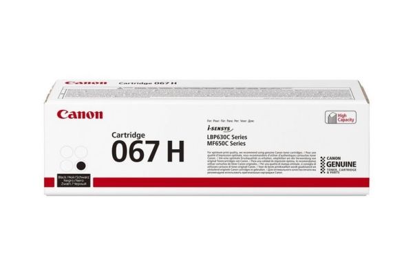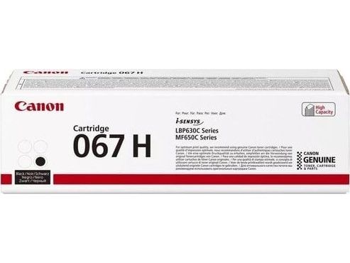 A high yield black toner cartridge enabling high quality printing and longevity with compatible i-SENSYS printersUse the high yield black toner cartridge 067H with your compatible laser printer to ensure your prints always look their best. A full cartridge yields approximately 3130 pages (ISO/IEC 19798), providing the longevity needed to handle all your printing demands.- Ensure optimum printing quality with genuine Canon toner- Print more with a high yield black cartridge for prints up to 3130 pages- Compliant with RoHS (2011/65/EU) and its amendments, including (2015/863/EU) and other RoHS-like legislations in countries/regions outside the EU, which means that materials are less hazardous to the environment- Return every toner cartridge to be reused or recycled – it's free, easy and environmentally responsibleCanon 067H. Black toner page yield: 3130 pages, Printing colours: Black, Quantity per pack: 1 pc(s)