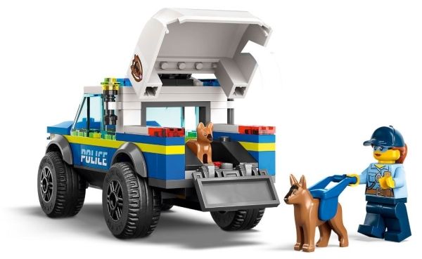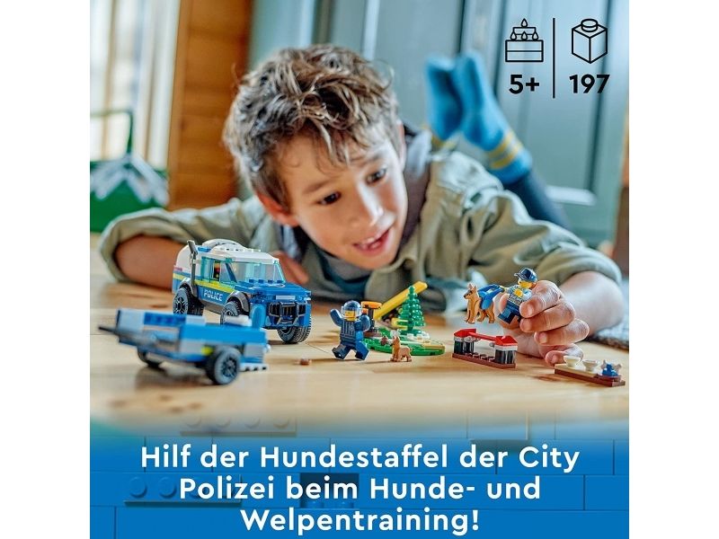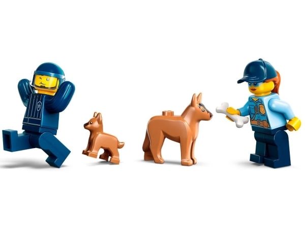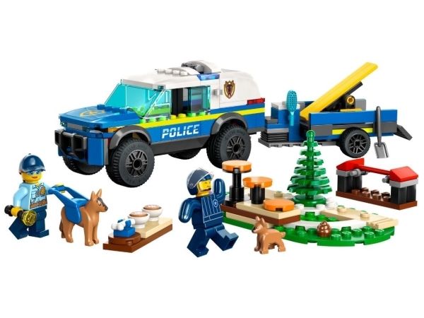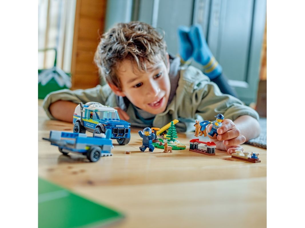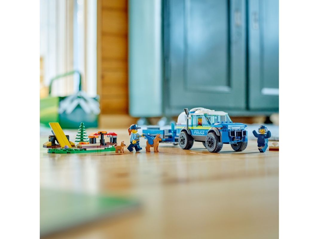 What’s in the box? – Everything kids need to build a toy police K9 SUV, trailer, 3 dog training apparatus and a training ground setting, plus 2 minifigures, a dog figure and a puppy figure