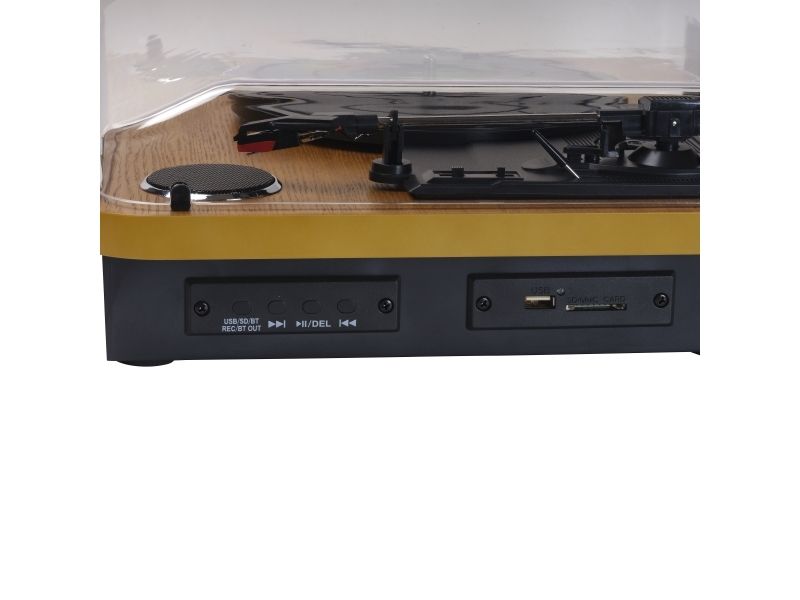 The DENVER VPL-230LW turntable is a modern audio system that combines the nostalgic appeal of vinyl with convenient features of digital music formats. With its ability to play from USB-host, vinyl records, and flash memory cards, this turntable offers versatility for music enthusiasts. The inclusion of Bluetooth connectivity allows for easy streaming from Bluetooth-enabled devices, making it simple to enjoy your music wirelessly. The VPL-230LW doesn't just play music; it enhances it, thanks to its built-in amplifier and speakers that produce a total output power of 20 W, ensuring every note is heard in clear, rich stereo sound. Additionally, the turntable supports a variety of playback speeds, including 33.3 rpm, 45 rpm, and 78 rpm, accommodating your entire vinyl collection. The semi-automatic operation, combined with features like a hinged detachable dust cover and the ability to record music, makes the DENVER VPL-230LW a comprehensive audio solution for both modern and vintage music lovers.