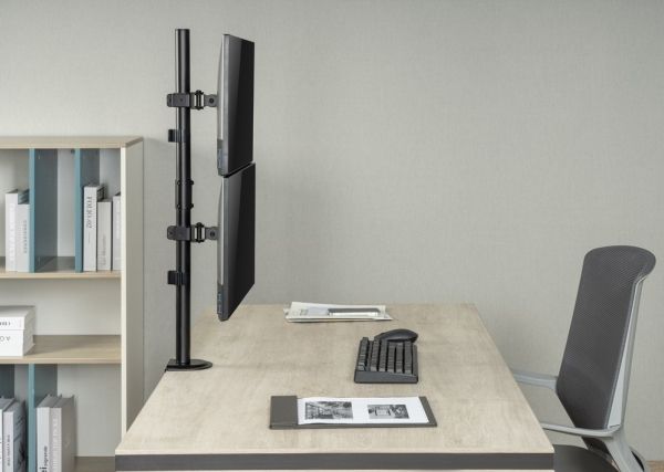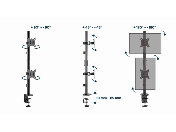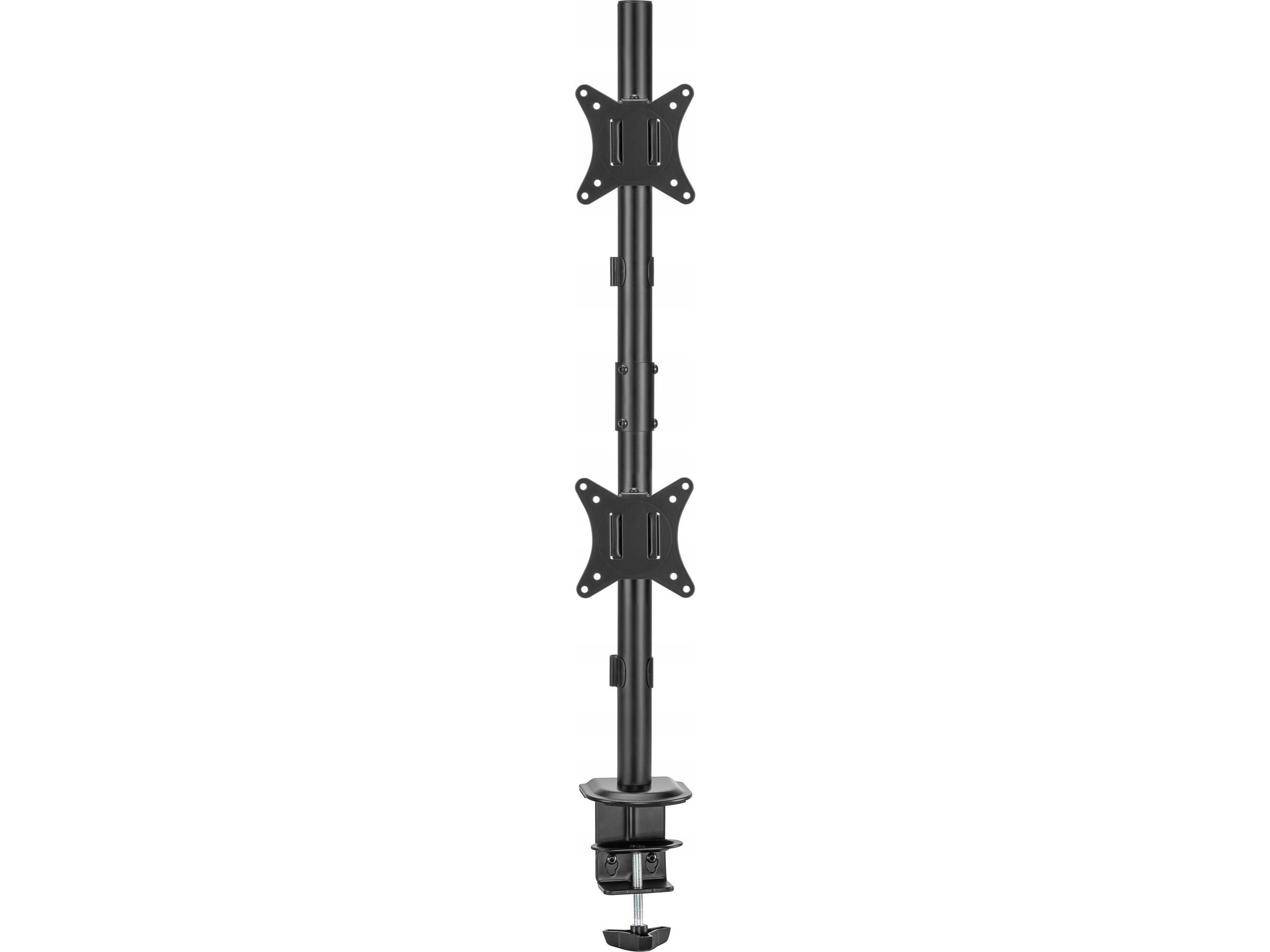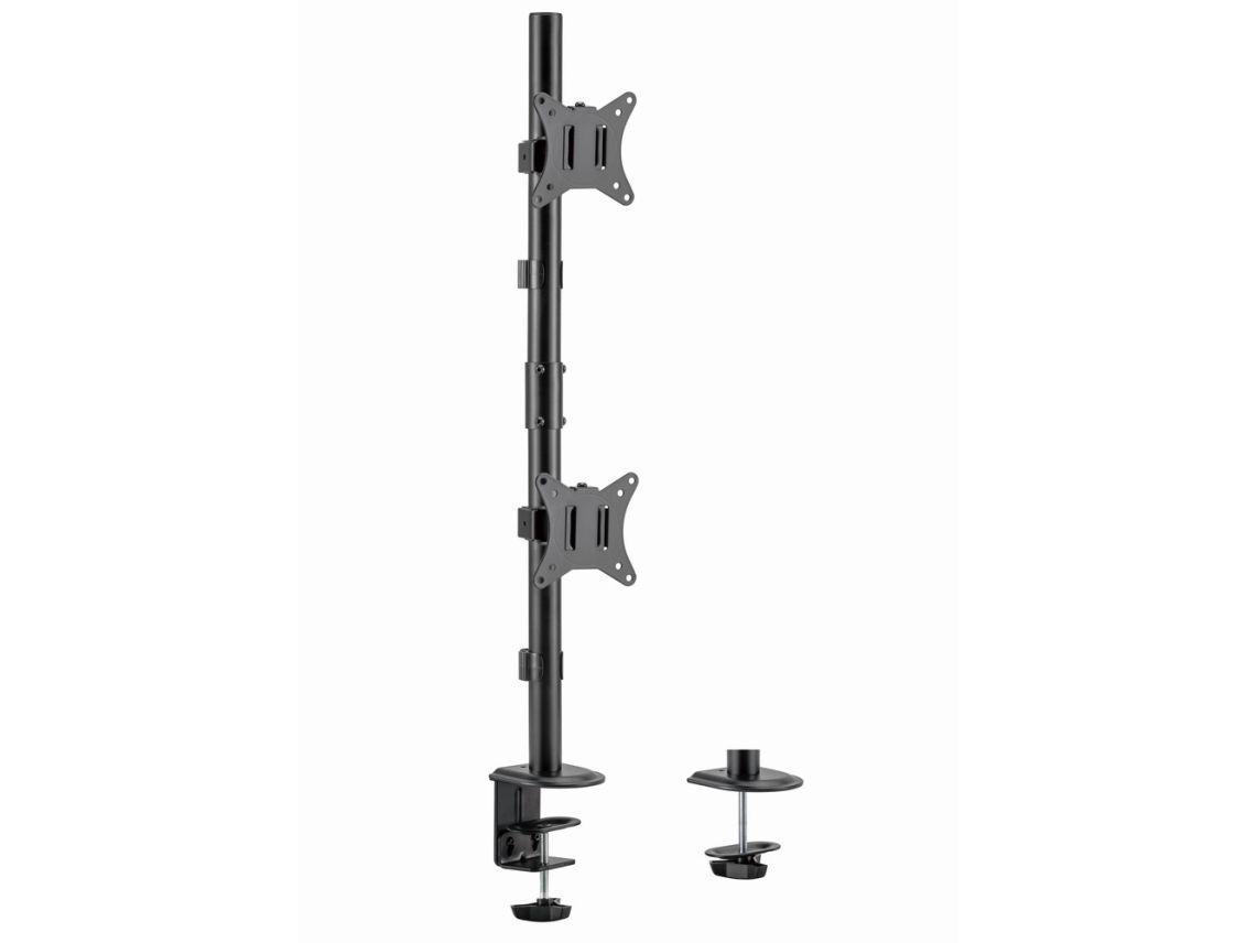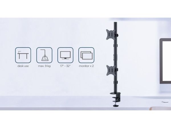 Kenmerken: Monitor desk mount for 2 monitors Each monitor mount is height adjustable and allows swivel, tilt and rotation Works with almost any LCD monitor (max. 32'') Strong desk clamp or grommet for easy and secure fixation on your desk Built-in cable management for an organized and neat workspace VESA compatible (100 x 100 mm and 75 x 75 mm) Specificaties: Material: steel, plastic Surface finish: powder coating Color: black Fit screen size: 17 '' - 32 '' Weight capacity: 9 kg (per display) VESA compatible: 75 x 75, 100 x 100 mm Tilt range: +45 ° ~ -45 ° Swivel range: +90 ° ~ -90 ° Screen Rotation: +180 ° ~ -180 ° Installation: Clamp, Grommet Max. desk thickness: Clamp: 10 ~ 85 mm, Grommet: 10 ~ 40 mm Cable management: Yes Net weight: 3.3 kg Dimensions: 116 x 146 x 957 mm Inhoud: Desk mounting arm elements Installation accessories kit Installation manual