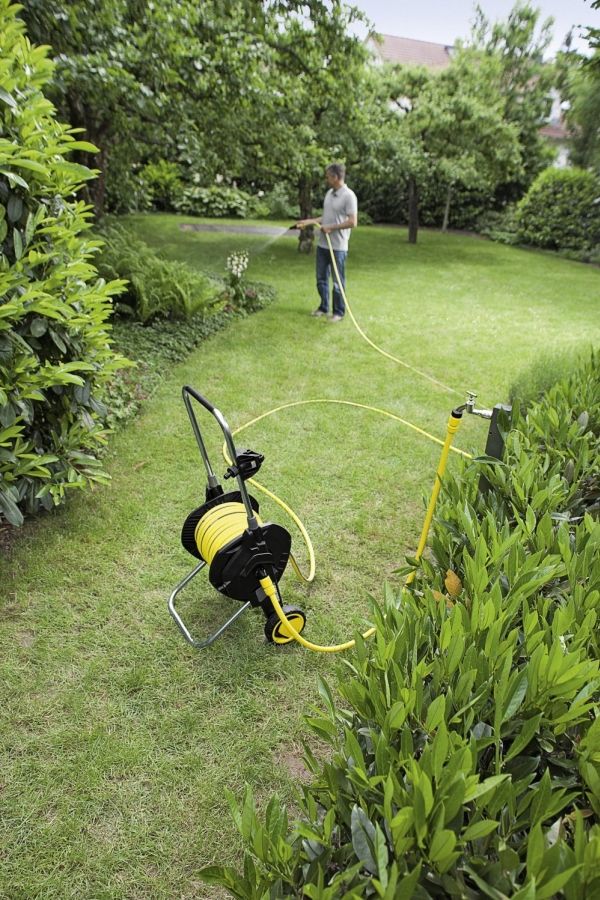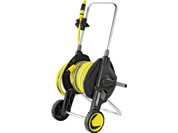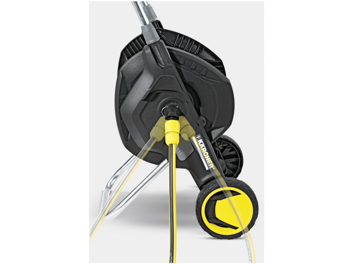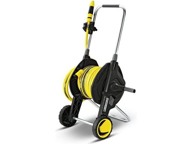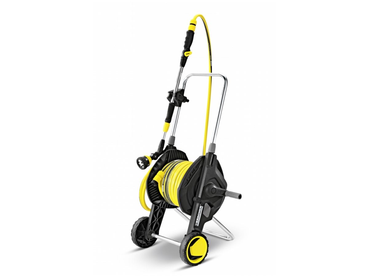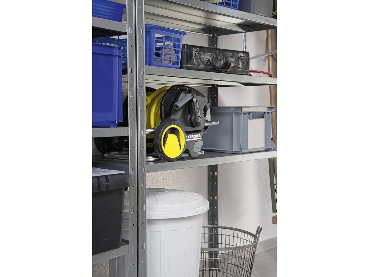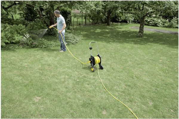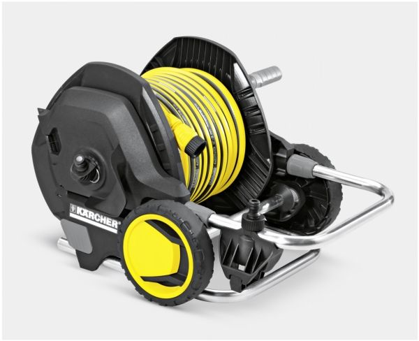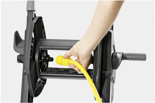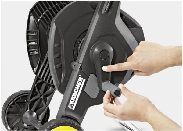 Very mobile hose trolley with accessory holder and storage hook. With height adjustable handle, angled hose connectors to avoid kinking of the hose, free-wheeling crank and innovative folding function for space-saving stowage. Fully assembled.