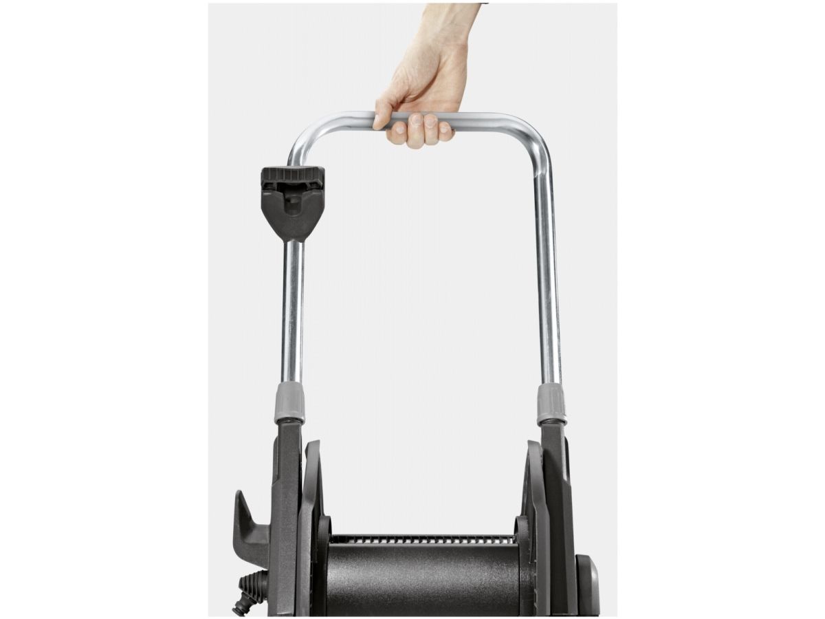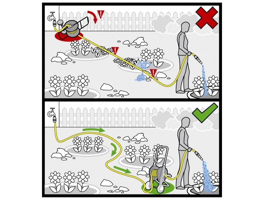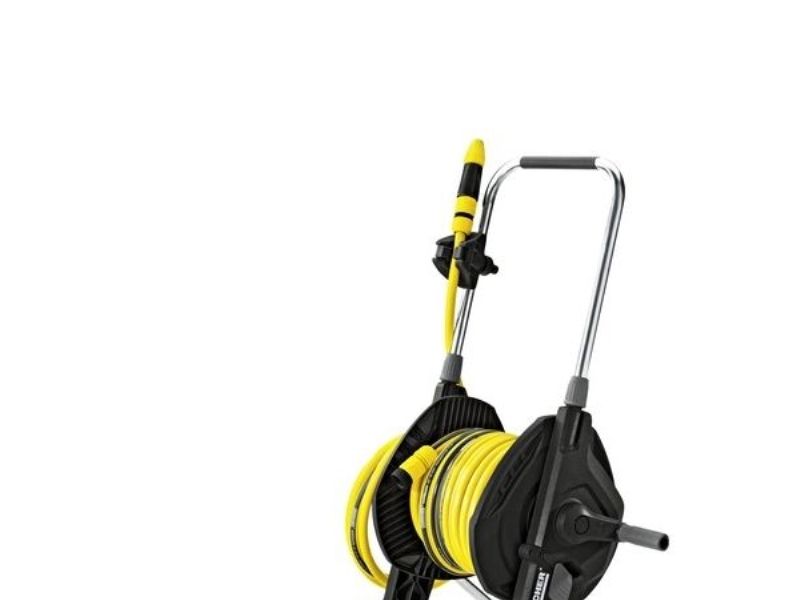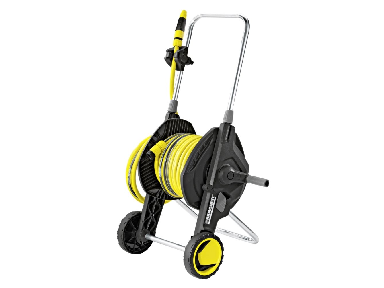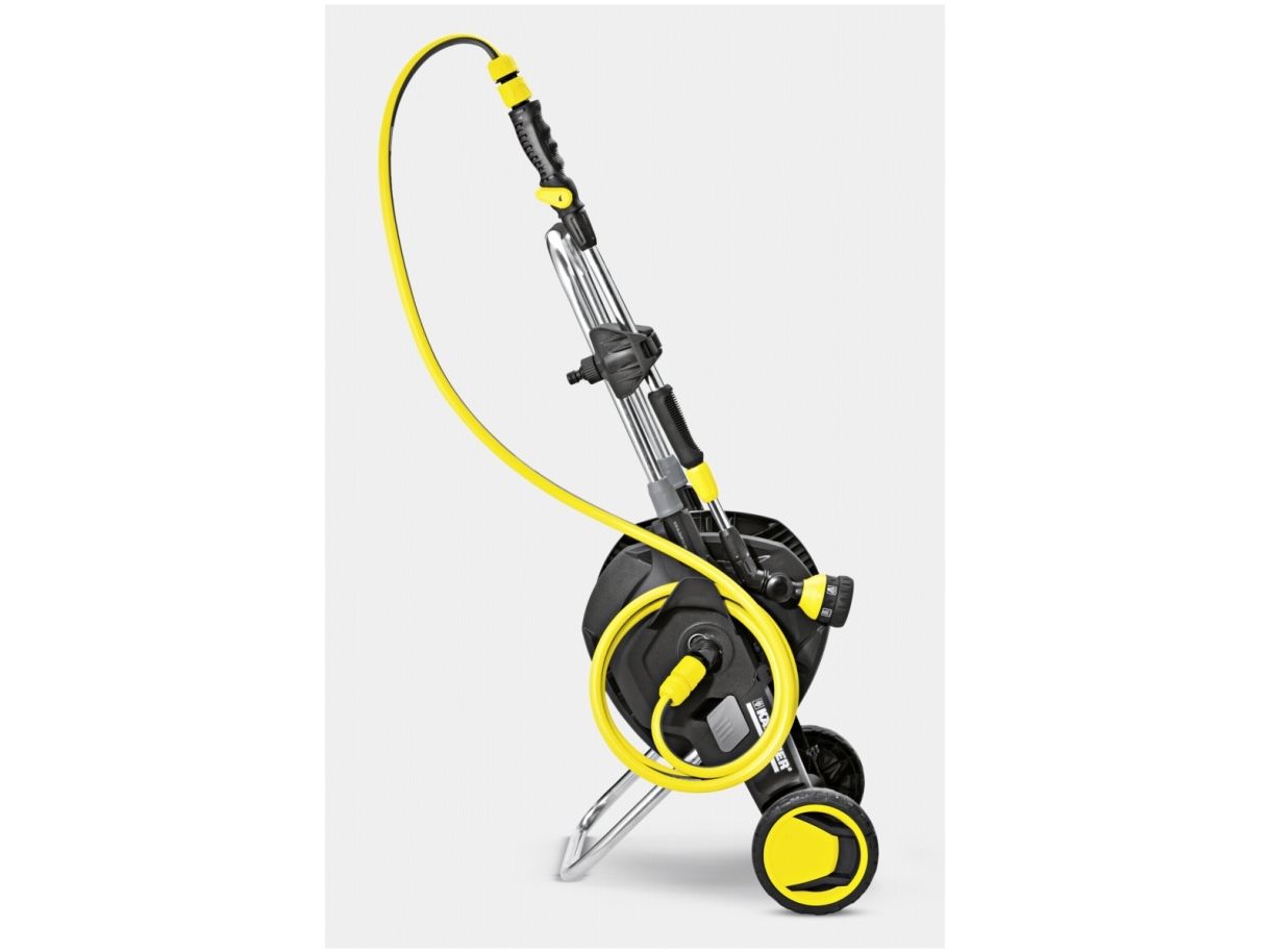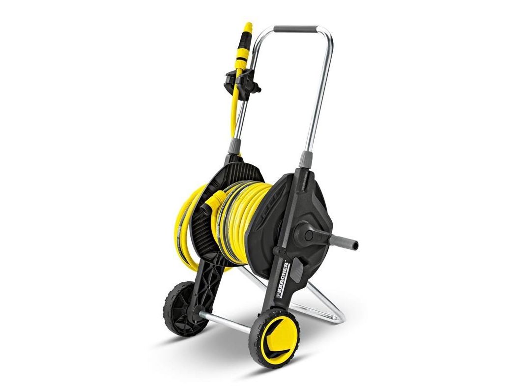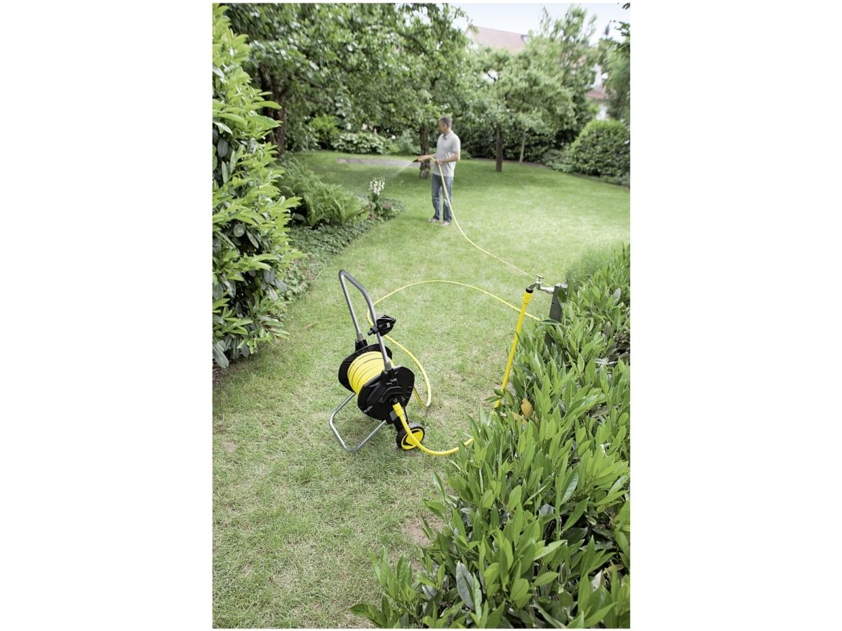 Very mobile hose trolley with accessory holder and storage hook. With height adjustable handle, angled hose connectors to avoid kinking of the hose, free-wheeling crank and innovative folding function for space-saving stowage. Fully assembled.