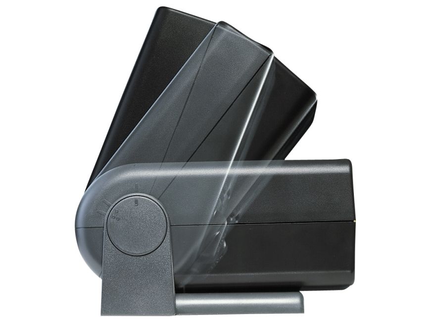 Slide viewer with 3x magnifying double lens for 5 x 5 cm (2 x 2 in.) framed slides and uncut film strips, change slider for convenient slide changing without annoying bright intervals, drop chute for up to 40 slides. Top section tiltable for adjusting desired viewing angle, mains connection.