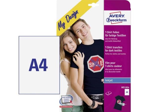 Die Textilfolie für farbige Textilien MD1004 von AVERY ZWECKFORM im A4 Format ist perfekt für originelle Geschenke oder Dekorationen. Mit dieser Transferfolie können Sie z.B. für den nächsten Kindergeburtstag T-Shirts bedrucken. Gewünschtes Motiv einfach am PC gestalten und mit einem Inkjet-Drucker bedrucken. Sie können damit nicht nur T-Shirts, sondern auch Kopfkissen, Schürzen, Tischdecken usw. bedrucken. Die Avery Zweckform Transferfolie eignet sich für alle farbigen Baumwolltextilien, so kommt das jeweilige Motiv besonders gut zur Geltung und überzeugt durch optimale Farbkraft. Die 8 Folien sind nach dem Aufbügeln waschmaschinenfest bei 30°C.