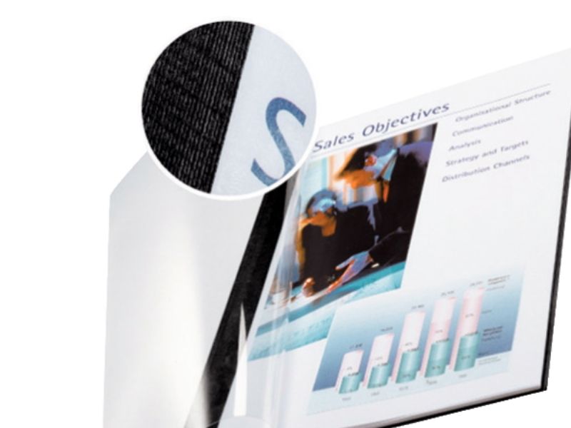- Tranparent front cover for individual title design - Spine and back cardboard cover in linen surface - Transparent front cover made of PET - 140 A4 sheet capacity (80 gsm)