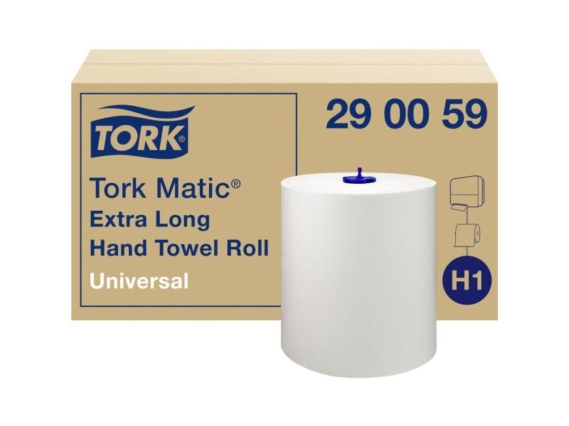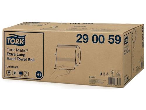 Tork Matic® Extra Long Håndklædeark på rulle med høj kapacitet, der er velegnet til travle toiletter f.eks. på skoler og i lufthavne. Rullerne er velegnede til Tork Matic® dispenser, som er designet til toiletter med mange brugere og sikrer nem vedligeholdelse.