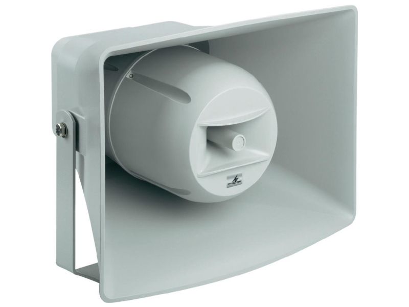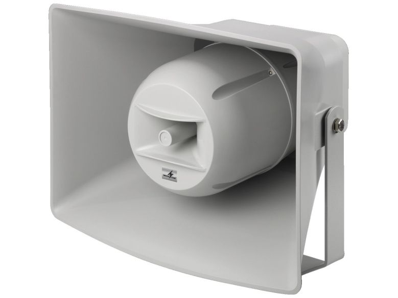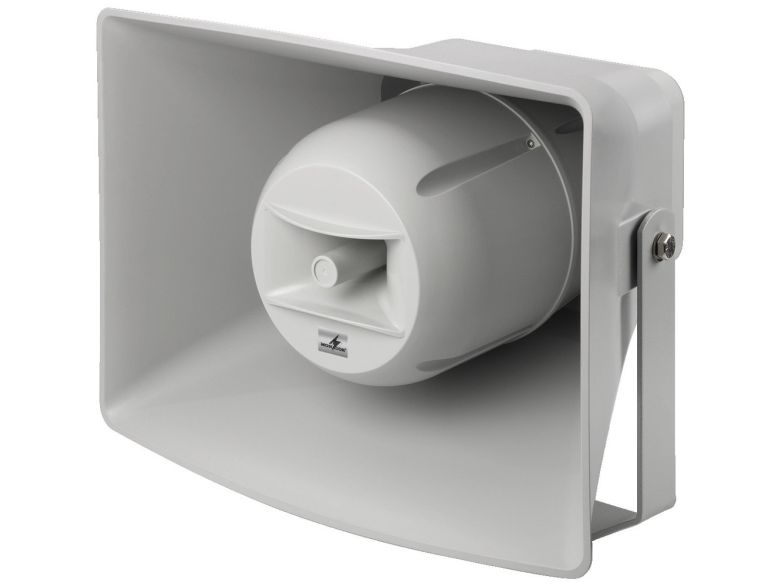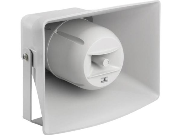 Weatherproof horn speaker (music horn), 2-way technology - 100 V line technique with very high tapping power - Weatherproof and IP66 certified - Very wideband sound with a distinct bass volume, even at very high volume levels - 16 cm bass-midrange speaker and 25 mm (1") horn - Robust plastic housing - Supplied with mounting bracket and screws made of stainless steel